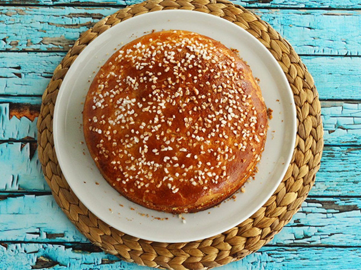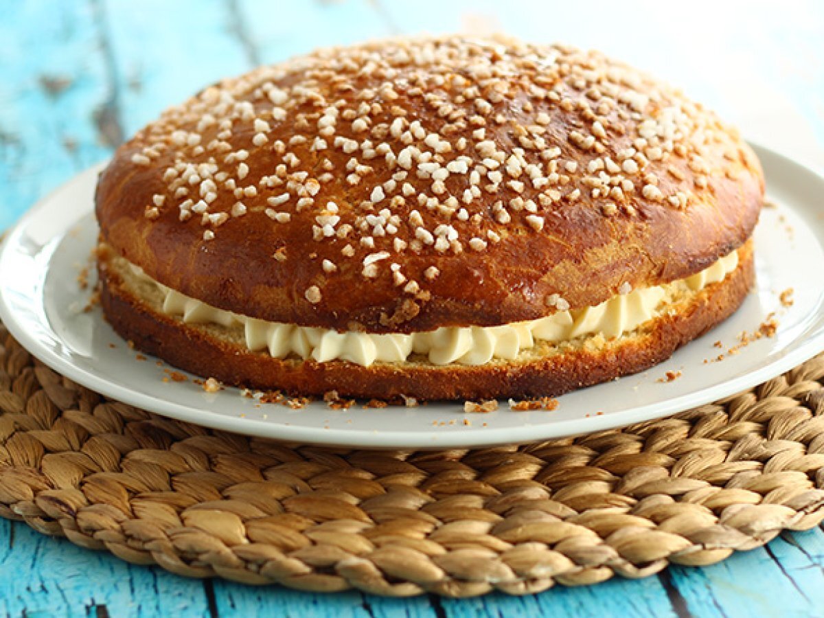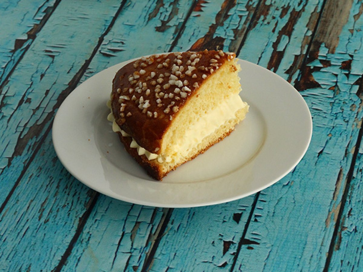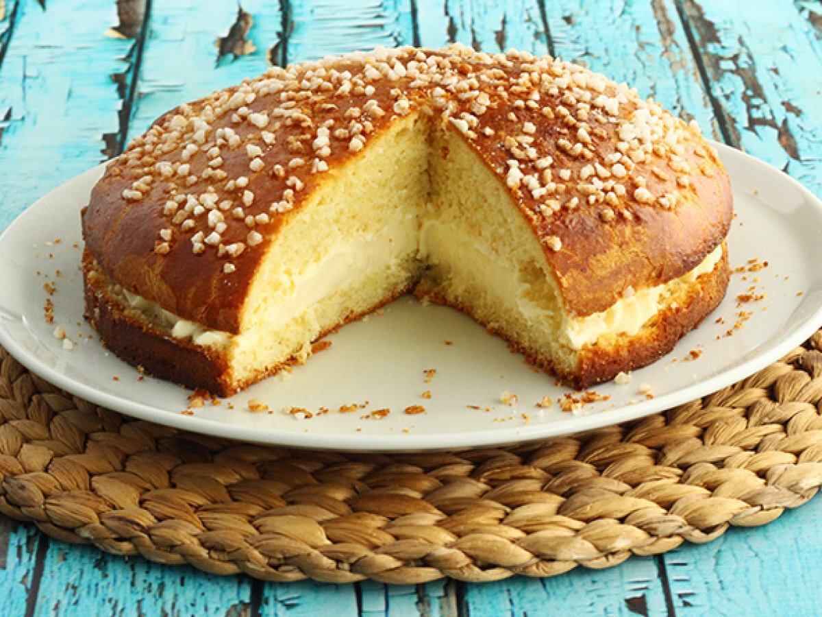 Scoateti inelul detasabil al formei de copt si ungeti-l cu unt. Asezati-l pe o tava pe care in prelabil ati pus hartie de copt.Puneti aluatul in centrul inelului. Lasati sa creasca timp de 2 ore la temperatura camerei, apoi ungeti cu ou batut, avand grija sa nu atingeti forma. Presarati generos zahar perlat.