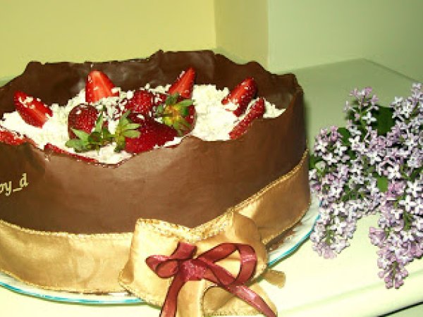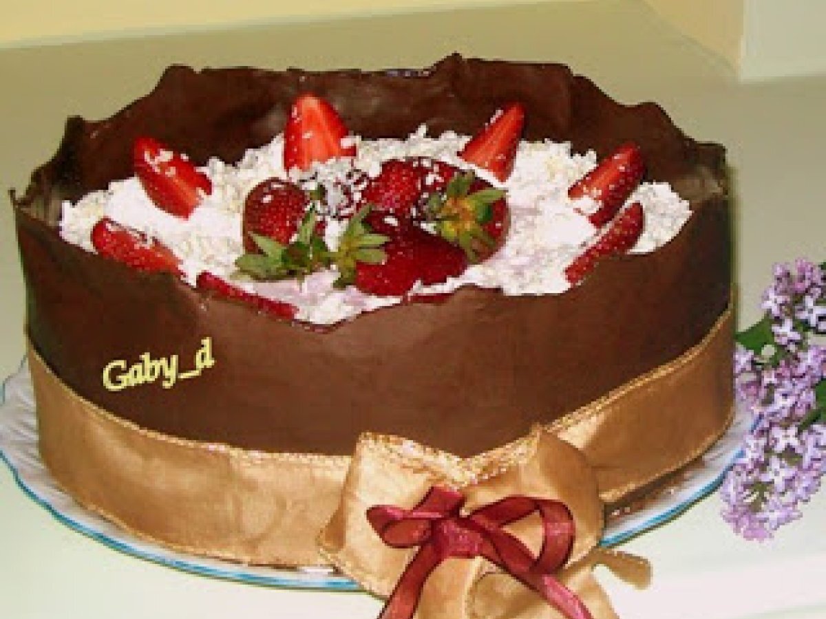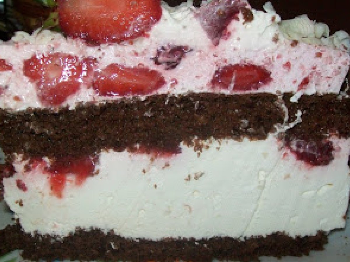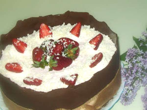 Tort aniversar cu ciocolata si capsuni PrecedentulUrmătorul DesertFoarte ușor55 min Trimite unui prieten Printează pagina Adresează o întrebare autorului Postează o poză cu rețeta gătită de tine Ingrediente 10 Pentru blat: 3 oua 100 g zahar 3 linguri cacao 65 ml apa calda 75 g.faina o lingurita praf copt un varf cutit-sare Pentru crema 1: 200 g ciocolata alba 550 ml frisca Doua plicuri gelatina 200 ml apa calduta Pentru crema2: 400 g capsuni 350 ml frisca Un plic gelatina 100 ml apa calduta Pentru décor 100 g ciocolata alba 100 g ciocolata amaruie Hartie pt copt In plus: 400 g capsuni 100 g frisca 50 g ciocolata rasa