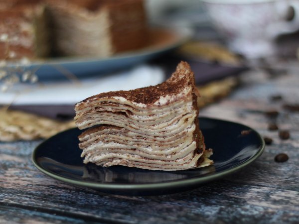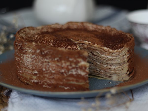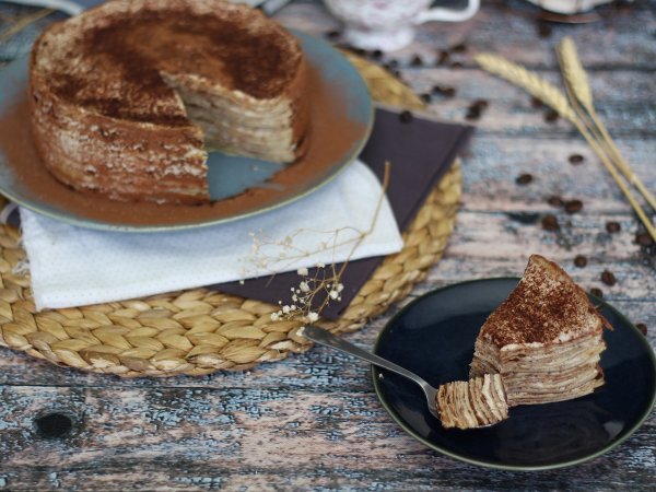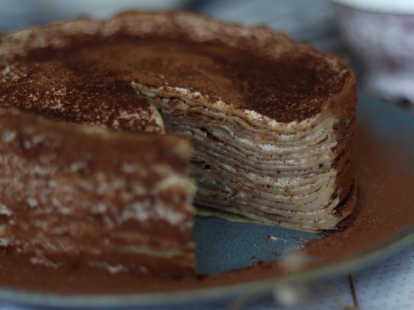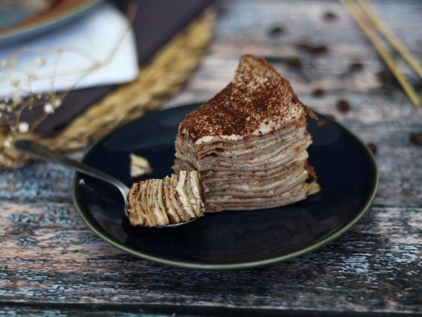 Tort cu clătite în stil tiramisu, cu cafea și cacao