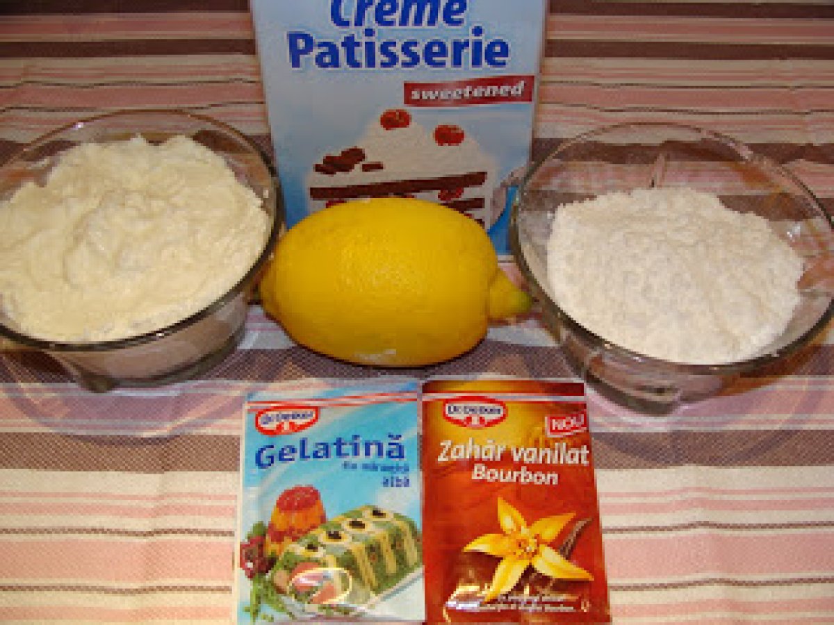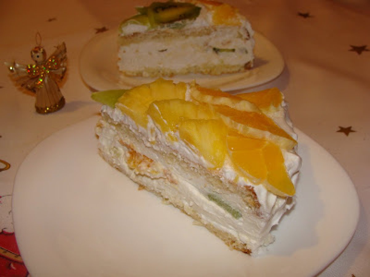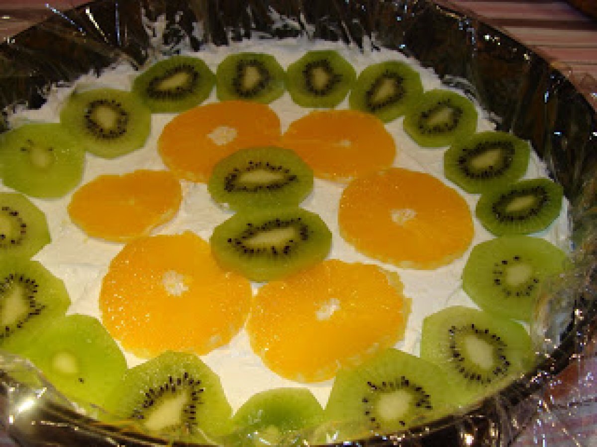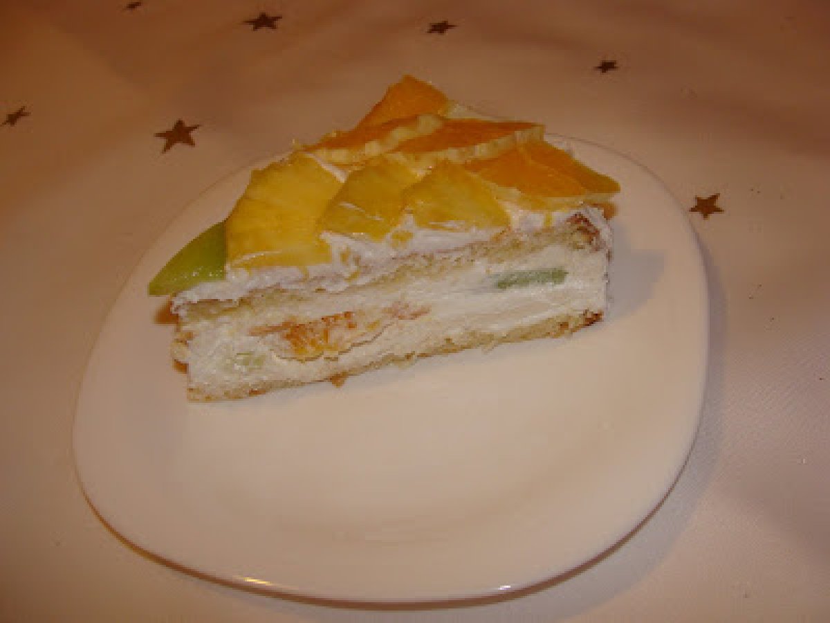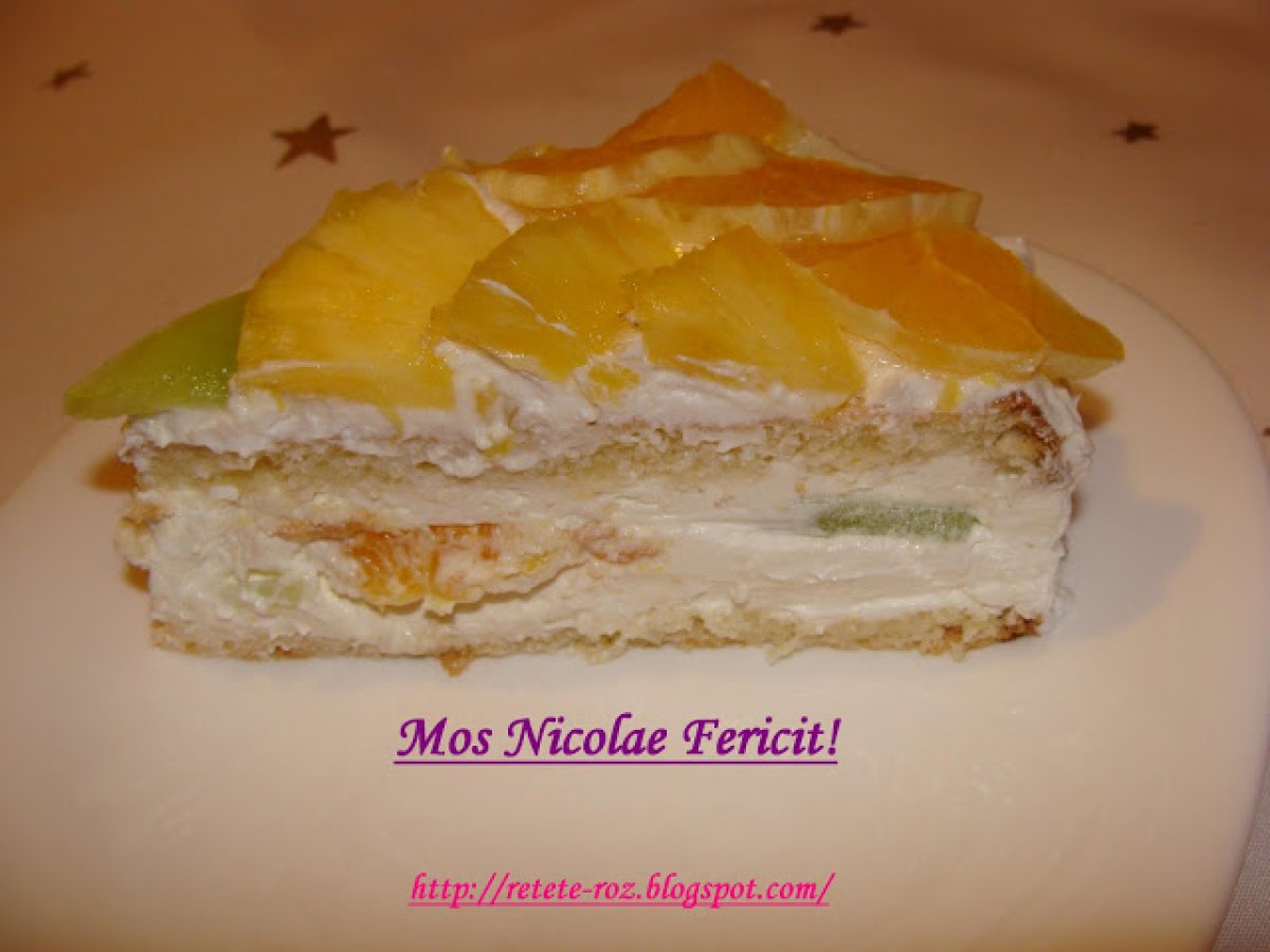 Tort cu crema de branza si fructe pentru mos nicolae :) PrecedentulUrmătorul DesertFoarte ușor1 h 30 m Trimite unui prieten Printează pagina Adresează o întrebare autorului Postează o poză cu rețeta gătită de tine Ingrediente 6 2 oua 75 g faina ( 3 linguri mari) 75 g zahar ( 3 linguri mari) 1 lingurita praf de copt 1 plic zahar vanilinat un varf de cutit de sare pentru crema: 250 g branza de vaci dietetica 350 ml frisca coaja rasa de la o lamaie 1 lingurita gelatina 100 g zahar praf 1 plic zahar vanilinat fructe: ananas, kiwi, portocale, mere