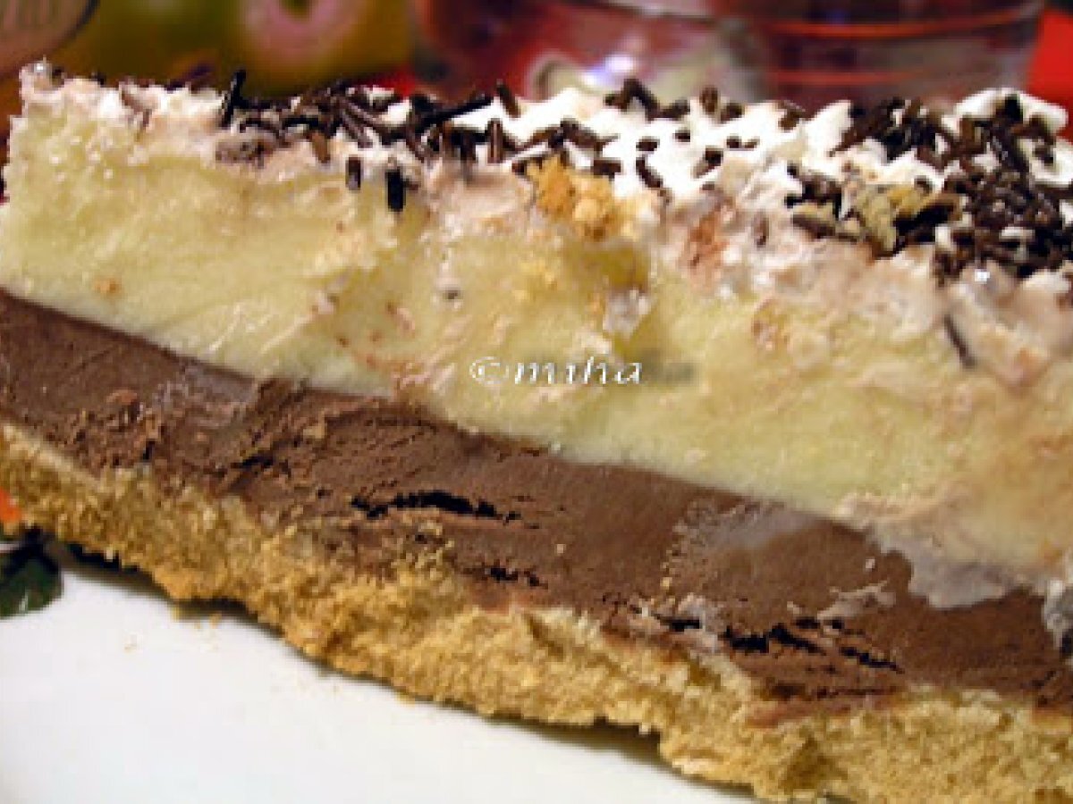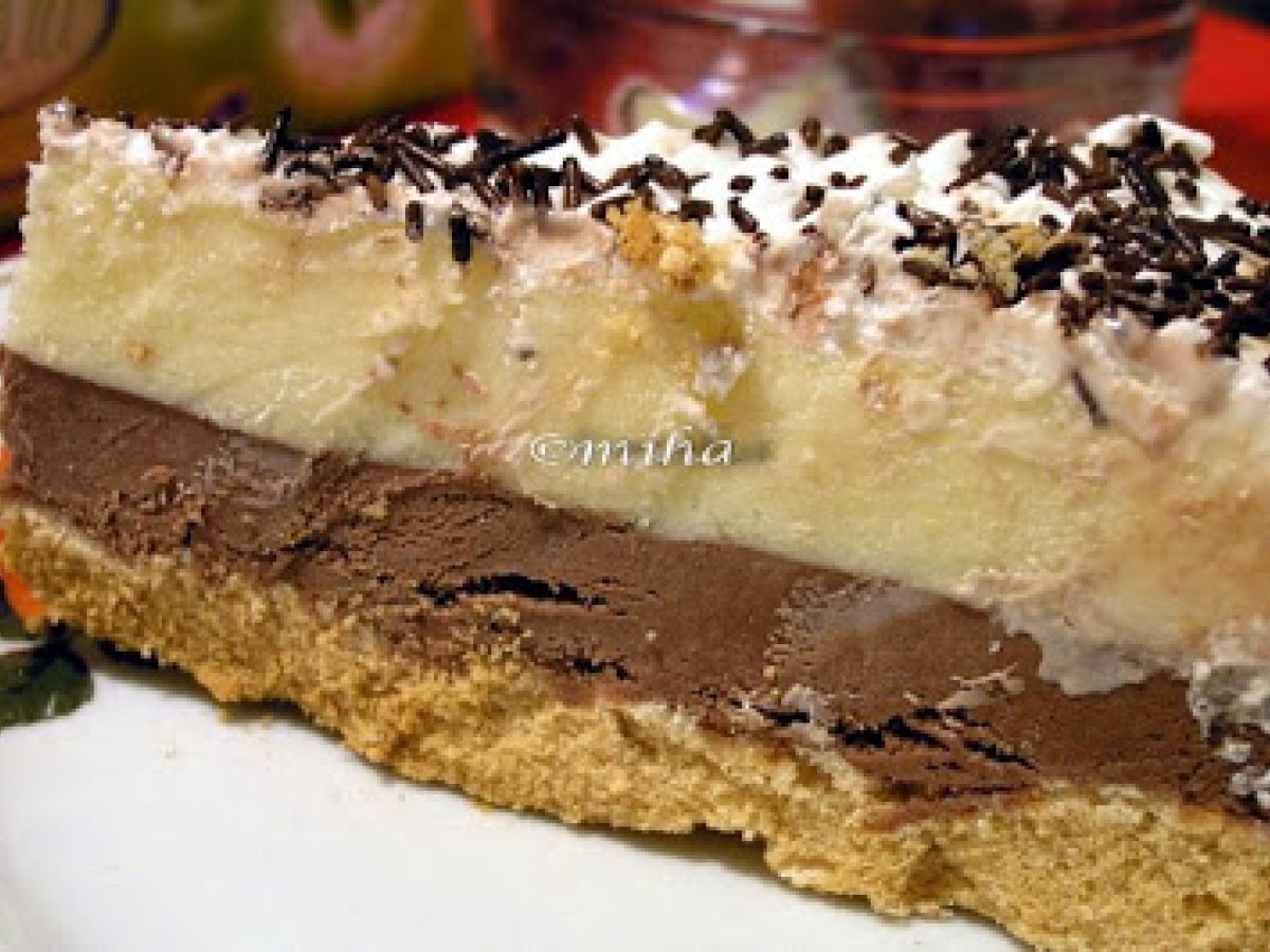 Tort cu inghetata de cacao si menta PrecedentulUrmătorul DesertFoarte ușor1 h 10 m Trimite unui prieten Printează pagina Adresează o întrebare autorului Postează o poză cu rețeta gătită de tine Ingrediente 4 4 albusuri 150 g zahar esenta de rom 250 g mascarpone 500 ml frisca lichida 2 galbenusuri 100 g zahar 100 ml lapte 4 lingurite cacao 4 linguri Nesquik 200 ml sirop de menta