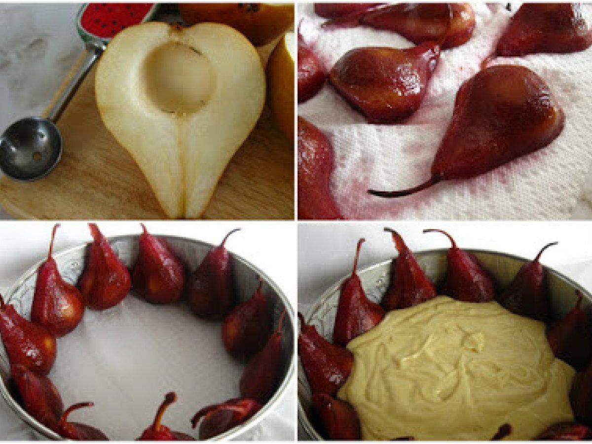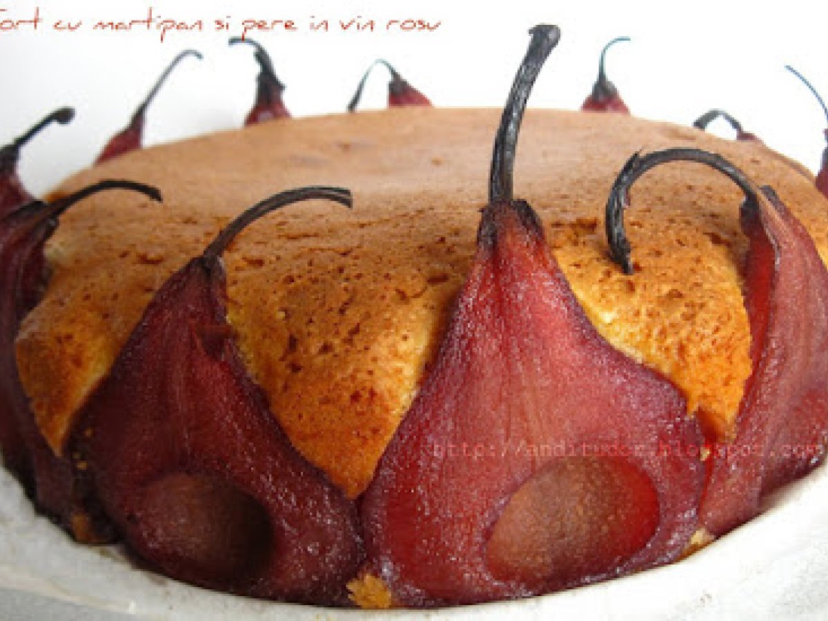 Tort cu martipan si pere in vin rosu PrecedentulUrmătorul DesertFoarte ușor50 min Trimite unui prieten Printează pagina Adresează o întrebare autorului Postează o poză cu rețeta gătită de tine Ingrediente 6 Pere poached: 750 ml vin rosu sec 180 g zahar 1 baton de scortisoara 6 pere coapte, dar cu pulpa ferma Aluatul: 200 g faina 180 g zahar 120 g unt la temperatura camerei 200 g martipan 1/2 plic praf de copt 3 oua mari