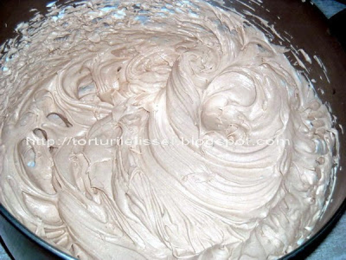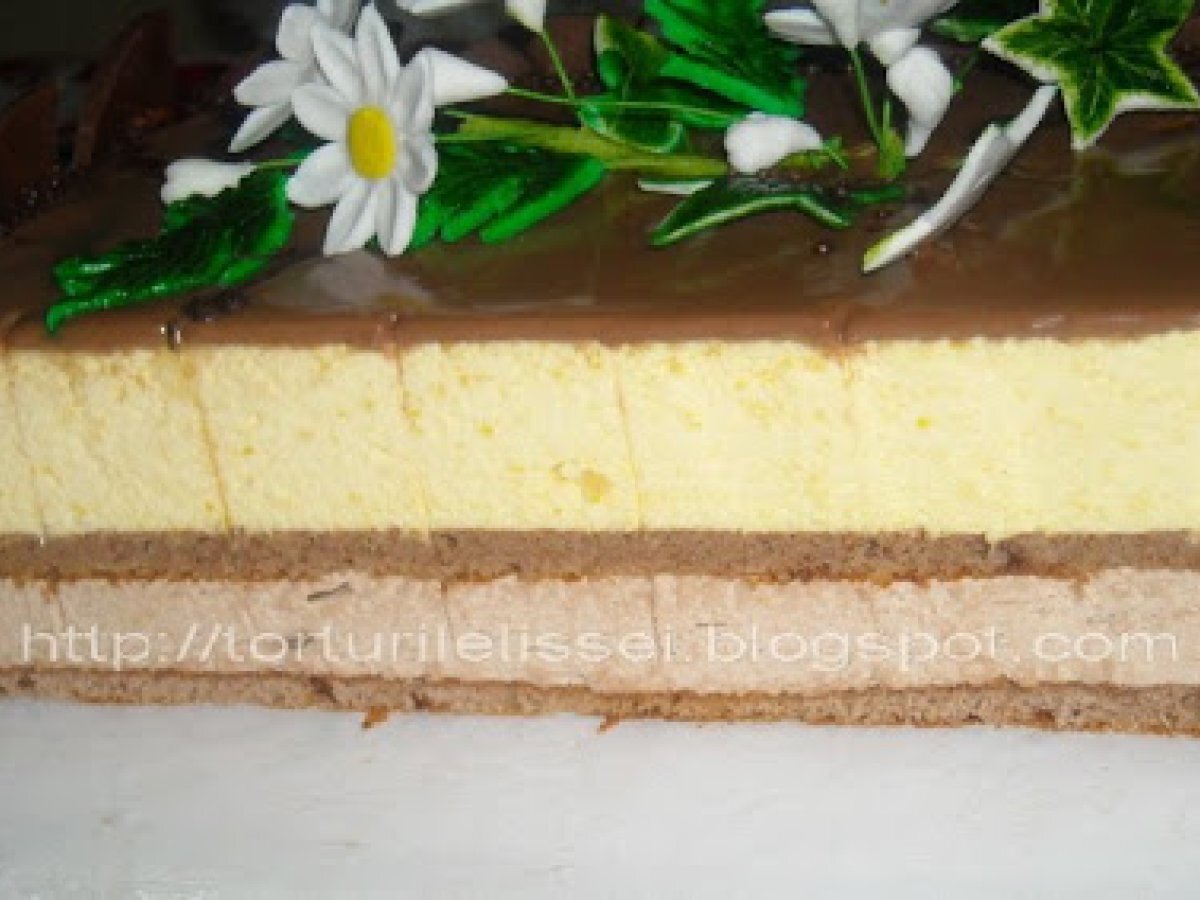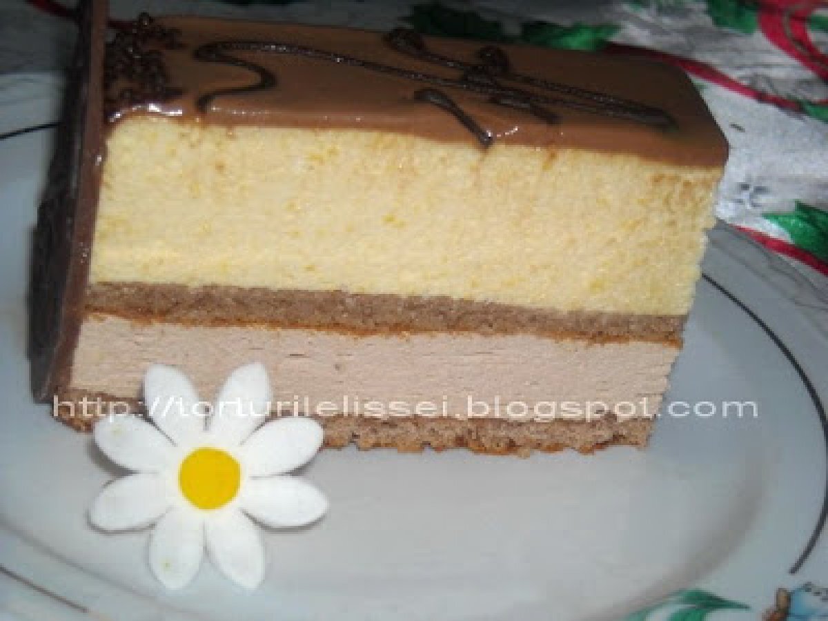 Tort cu mousse de ciocolata si mousse de piersici PrecedentulUrmătorul DesertFoarte ușor2 h 10 m Trimite unui prieten Printează pagina Adresează o întrebare autorului Postează o poză cu rețeta gătită de tine Ingrediente 8 150 g ciocolata amaruie 40 g unt 2 galbenuse 4 albuse 100 g zahar 6o g faina un praf de sare(un varf de cutit). Crema -mousse de ciocolata: 150 g ciocolata cu lapte 3 galbenuse un albus 150 g zahar 200 ml frisca 10 g gelatina vanilie un compot de piersici de 850g 2 oua 200 ml frisca 150 ml sirop de fructul pasiunii 20 g gelatina.