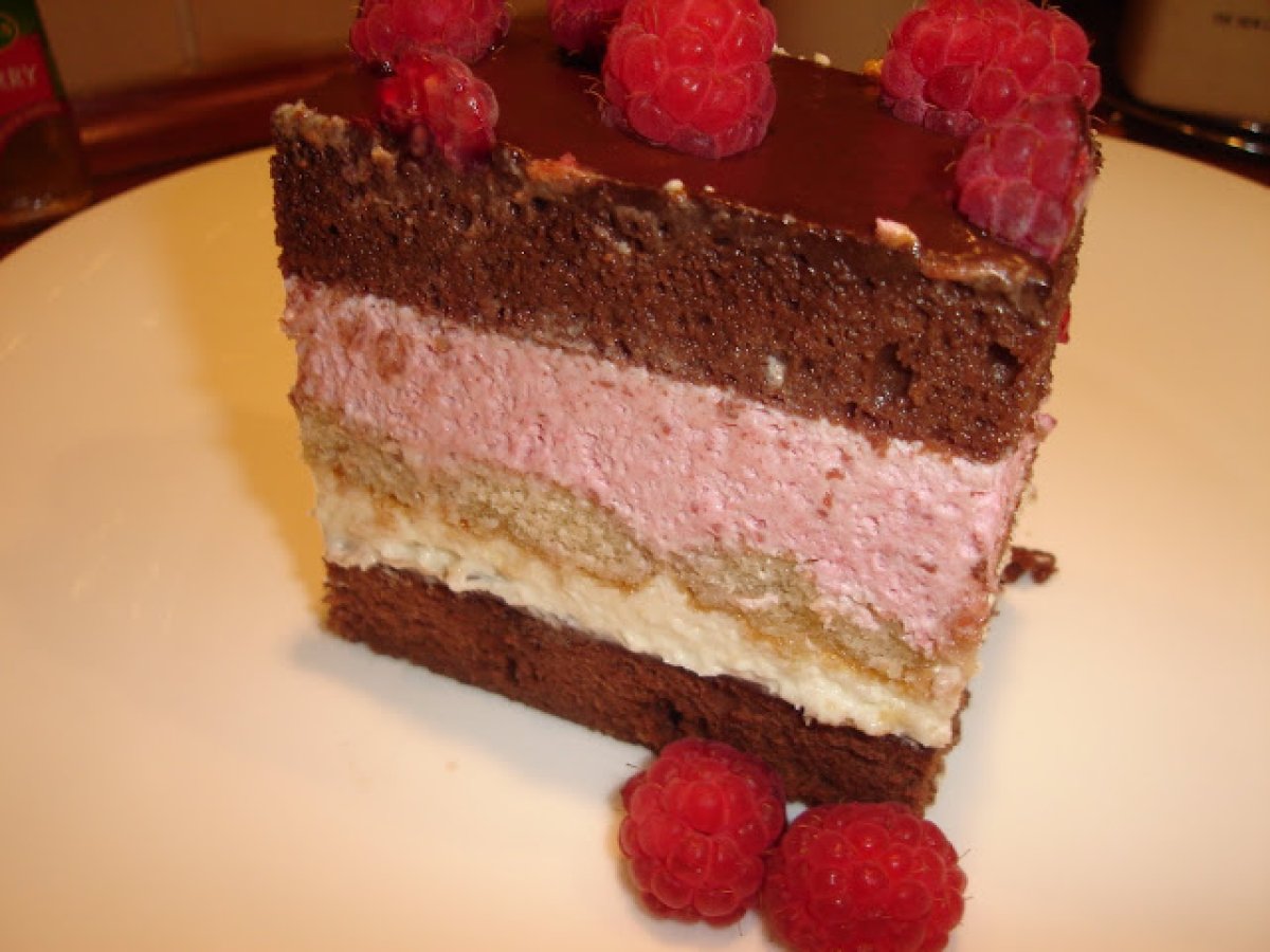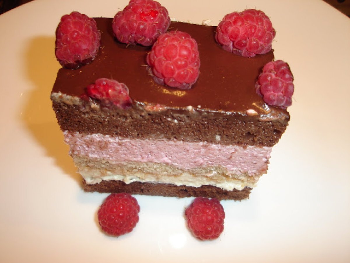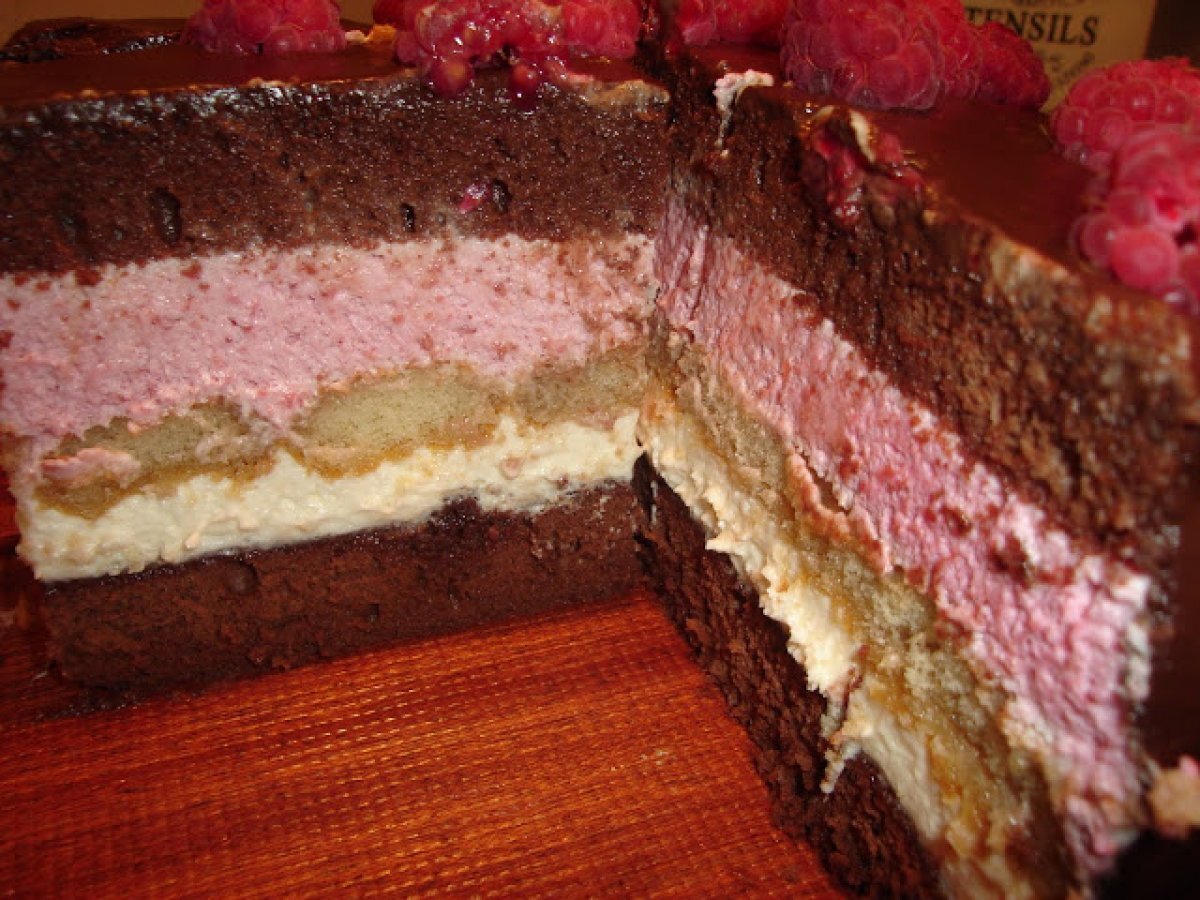 Tort cu mousse de zmeura si ciocolata alba PrecedentulUrmătorul DesertFoarte ușor55 min Trimite unui prieten Printează pagina Adresează o întrebare autorului Postează o poză cu rețeta gătită de tine Ingrediente 8 Blatul: 5 oua 5 linguri apa 10 linguri zahar 8 linguri faina 2 linguri cacao. Mousse de zmeura: 200 g zmeura 3 galbenusuri 1 albus 6 linguri lapte 150 g zahar 200 ml frisca 10 gr gelatina Glazura: 160 ml smantana 100 g zahar 100 g cacao 160 ml apa rece 10 g gelatina