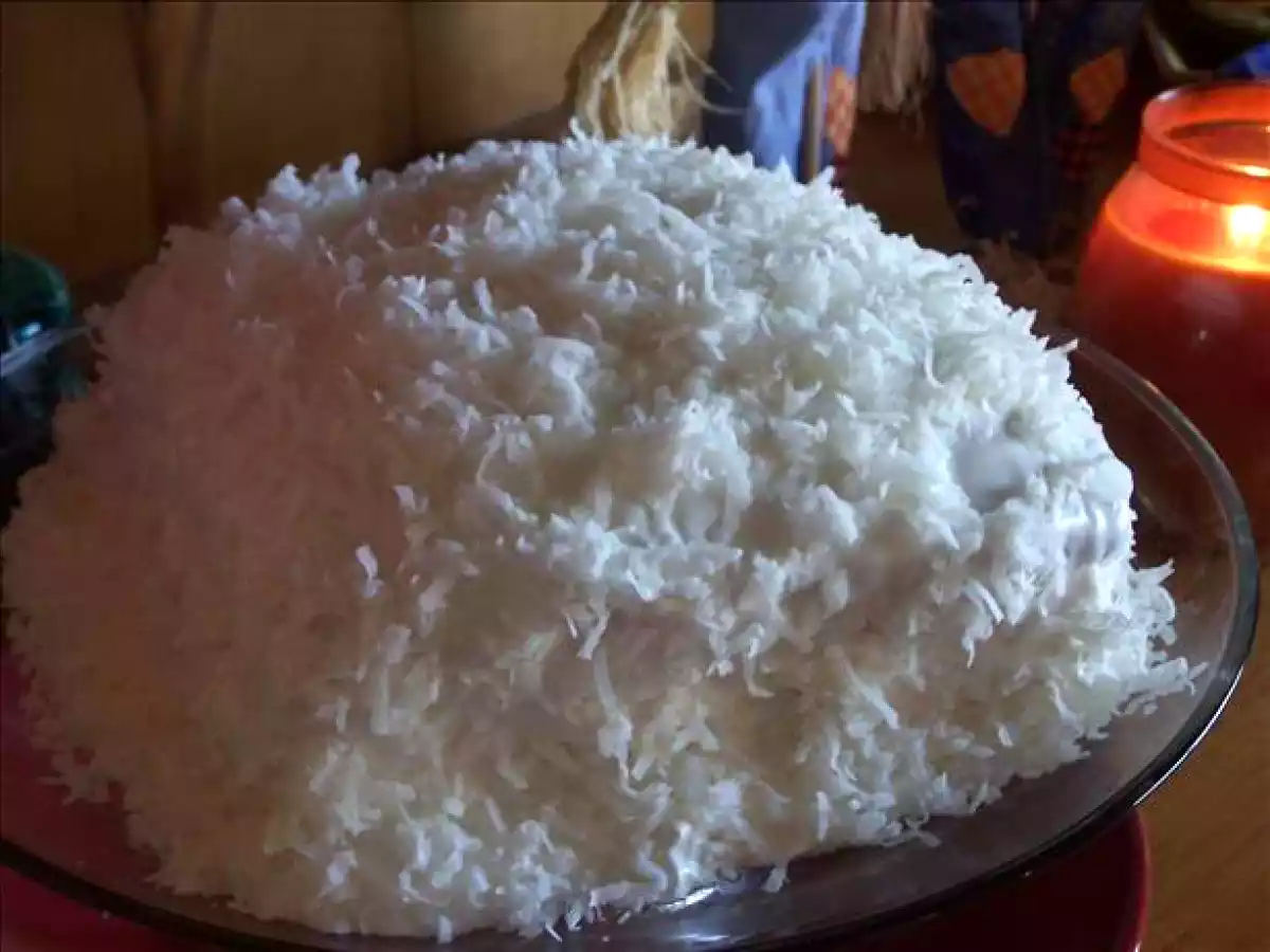 Tort cu nuca de cocos DesertFoarte ușor1 h 20 m571 Kcal Trimite unui prieten Printează pagina Adresează o întrebare autorului Postează o poză cu rețeta gătită de tine Ingrediente 6 300 g de nuca de cocos fulgi 200 g zahar 100 g faina 2 oua 3 albusuri 300 g frisca un varf de scortisoara 1 plic de zahar vanilat Cost estimat: 8.18Euros€ (1.36€/porție)