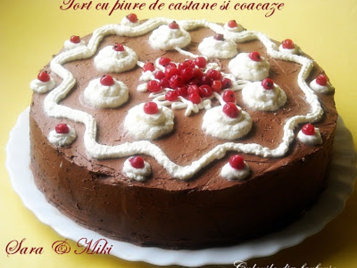Tort cu piure de castane si coacaze rosii PrecedentulUrmătorul DesertFoarte ușor45 min Trimite unui prieten Printează pagina Adresează o întrebare autorului Postează o poză cu rețeta gătită de tine Ingrediente 10 6 oua 2 lg de ulei 6 lg de zahar 6 linguri de faina 2 linguri cacao Pentru umplutura cu piure de castane: 250 g piureul de castane 200 frisca Hulala Pentru ganachul de ciocolata: 200 g ciocolata 200 g frisca Hulala coacaze rosi