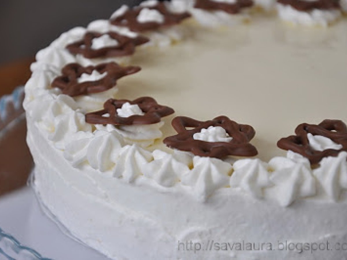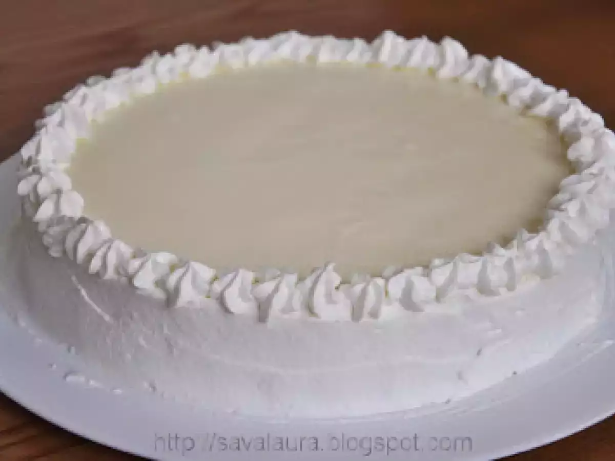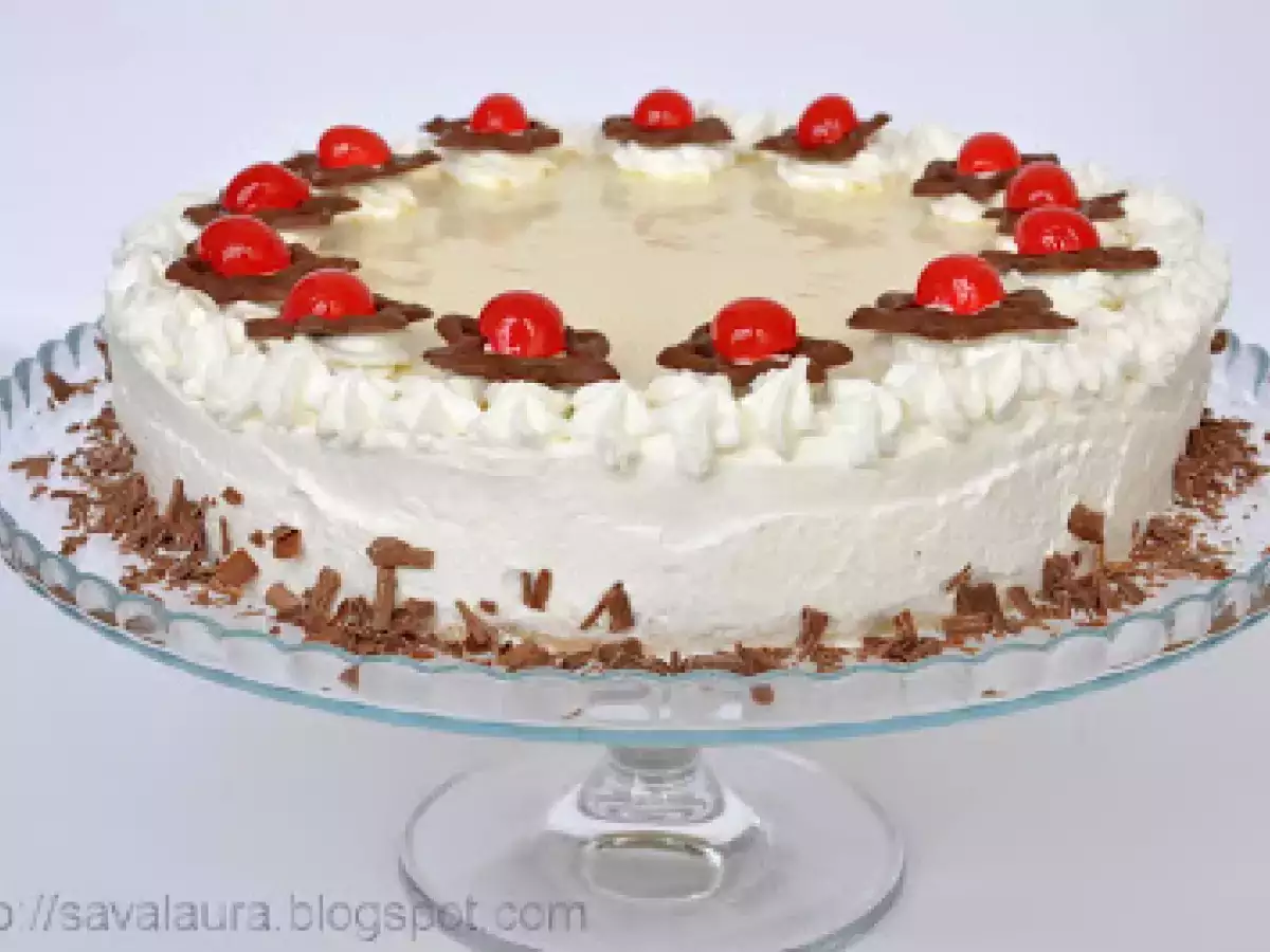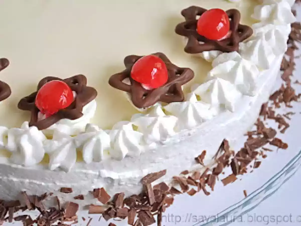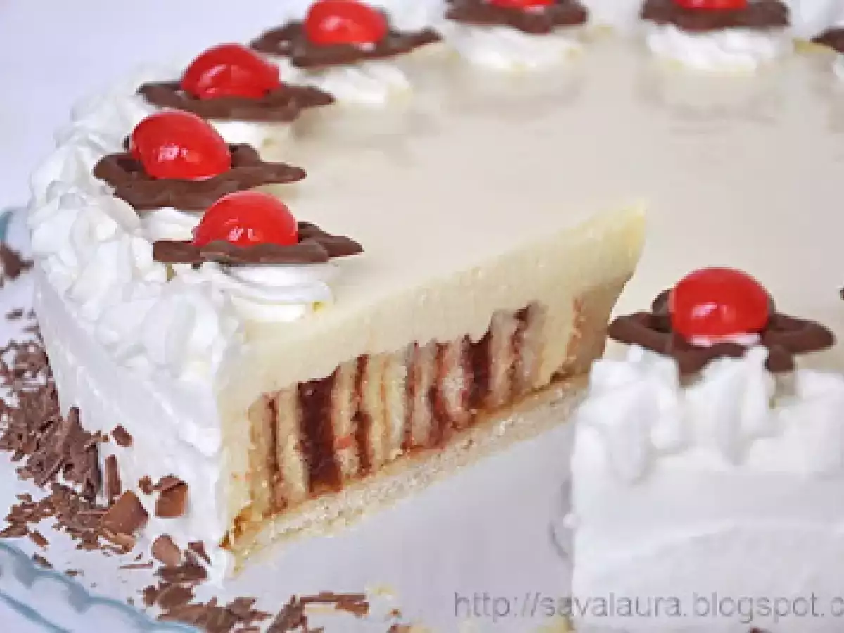 Tort cu rulada de capsuni si crema de vanilie PrecedentulUrmătorul DesertFoarte ușor1 h 10 m Trimite unui prieten Printează pagina Adresează o întrebare autorului Postează o poză cu rețeta gătită de tine Ingrediente 10 Pentru aluatul fraged: 200 g. faina 1 lingurita rasa praf de copt 60 g. zahar 1 pliculet zahar vanilat 1 praf de sare 1 ou 125 g. unt rece Pentru crema: 150-180 g. gem de piersici 450 ml. lapte 1 plic praf de budinca de vanilie 50 g. zahar 3 foi gelatina sau 5 g. gelatina granule 100 ml. frisca lichida 200 g. crema de branza Mascarpone/Exquisa/Philadelphia Pentru ornat: 100 ml. frisca lichida 1 pliculet intaritor de frisca 200 g. ciocolata cu lapte cirese glasate sau din cocktail