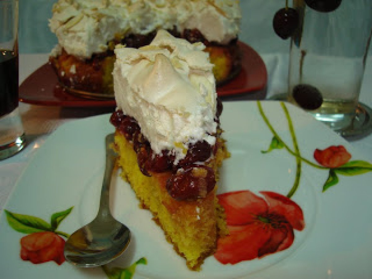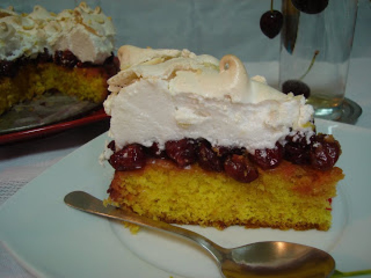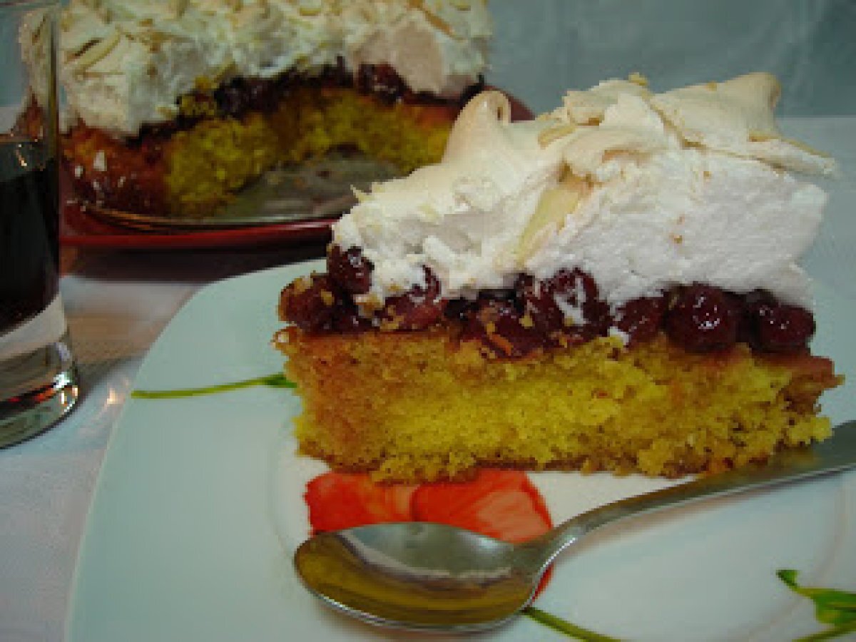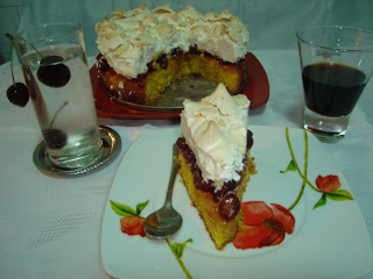 Tort cu visine si bezea PrecedentulUrmătorul DesertFoarte ușor50 min Trimite unui prieten Printează pagina Adresează o întrebare autorului Postează o poză cu rețeta gătită de tine Ingrediente 8 Pt. blat: 1 ou, 5 galbenusuri, 100 g zahar, 150 g faina, 1 praf de copt. Pt. bezea: 5 albusuri, 2 pliculete zahar vanilat, 200g zahar, 1 lingura zeama de lamaie, visine conservate sau alte fructe proaspete de sezon, 100 g migdale, 1 lamaie.