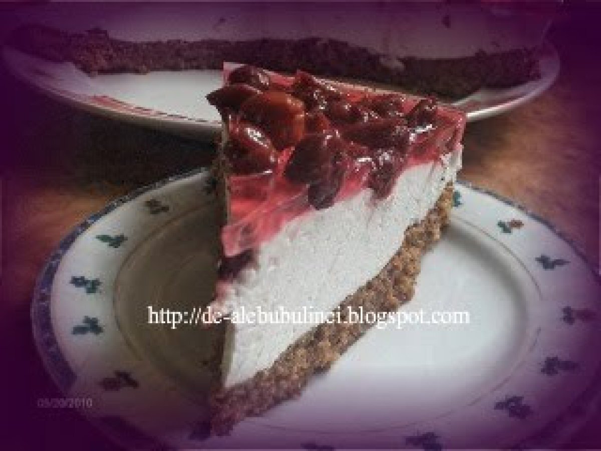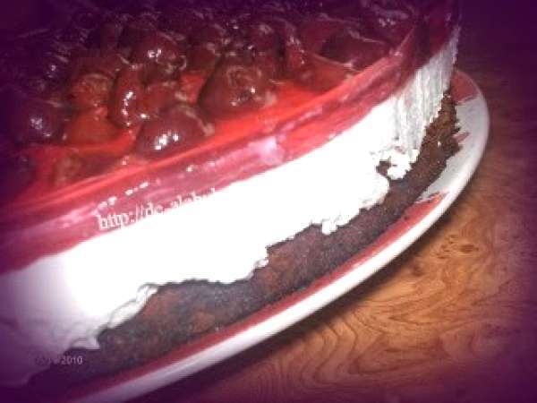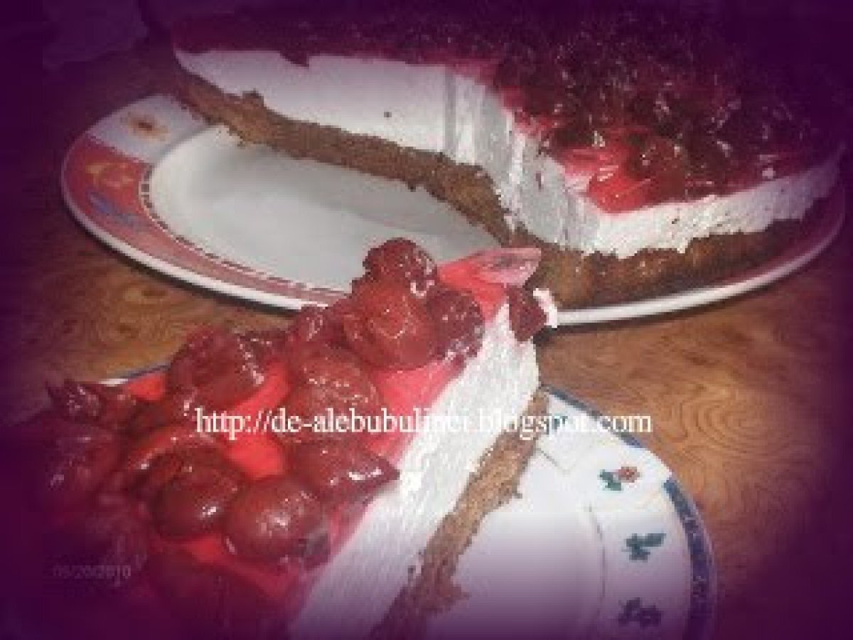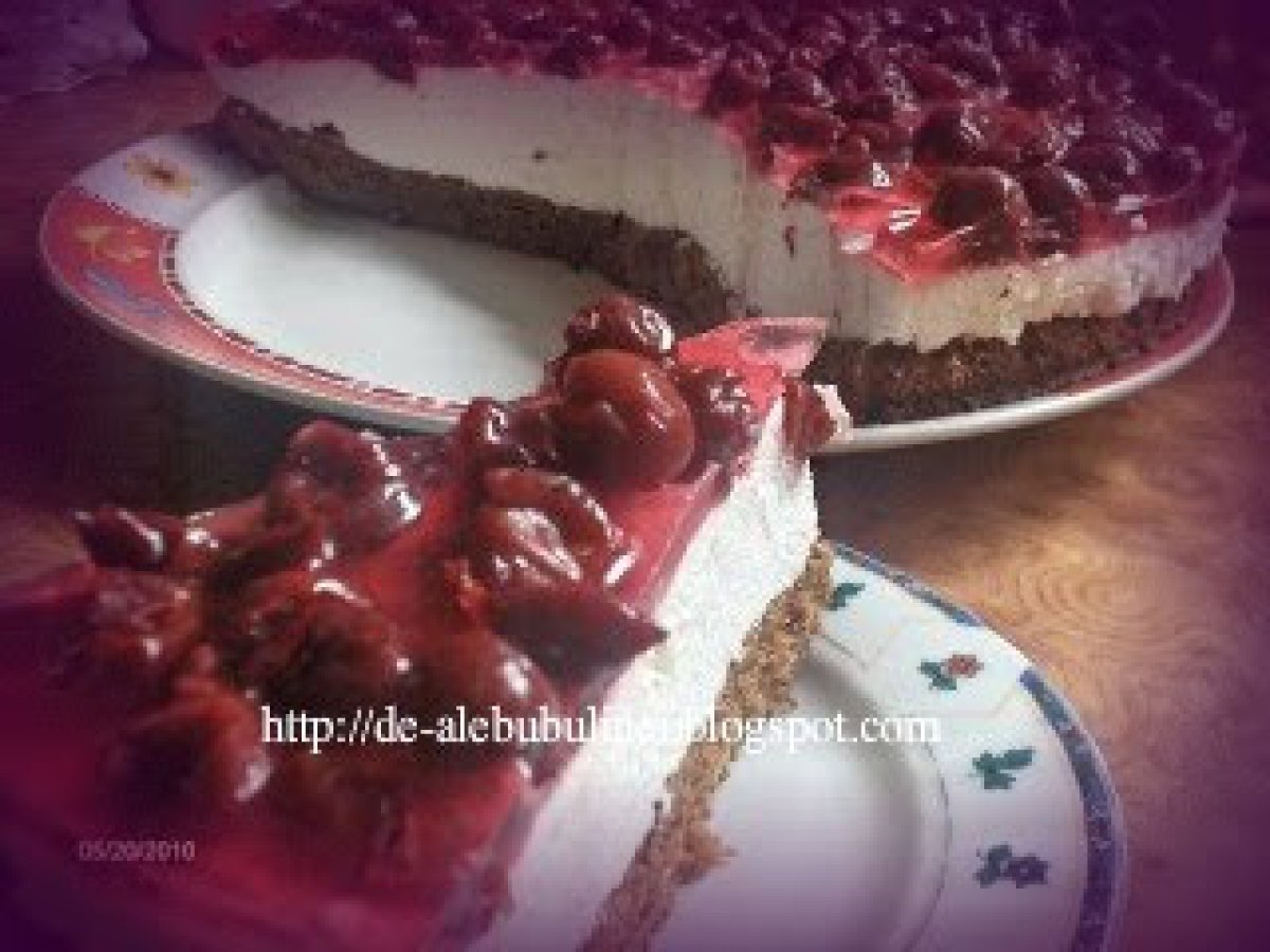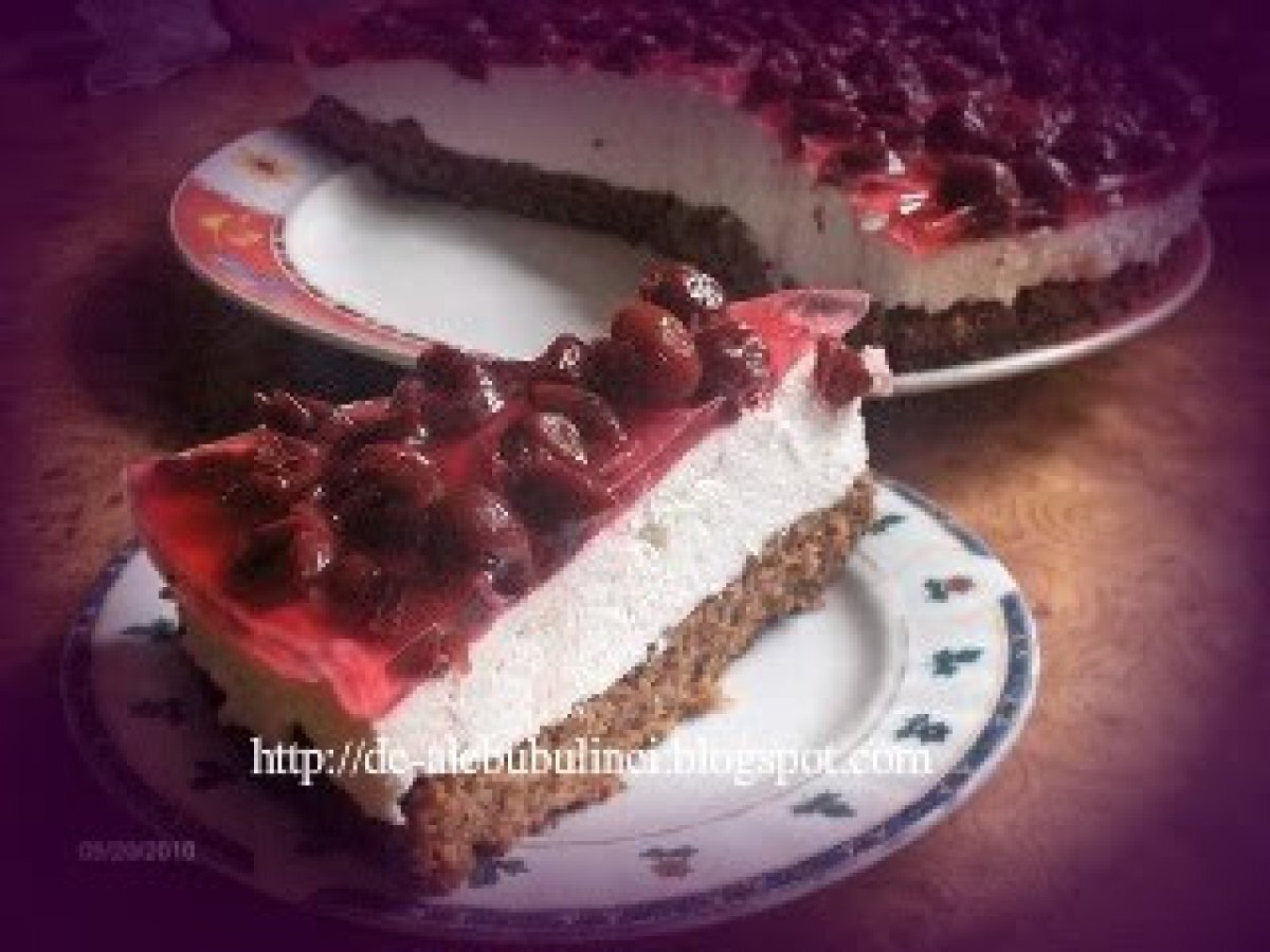 Tort cu visine si iaurt PrecedentulUrmătorul DesertFoarte ușor50 min Trimite unui prieten Printează pagina Adresează o întrebare autorului Postează o poză cu rețeta gătită de tine Ingrediente 8 4 oua, 120 g zahar, 100 g faina, 10 g cacao, 3 linguri nuca macinata, un praf de sare. Pentru crema am folosit: 400 g iaurt, 150 g zahar, 2 plicuri gelatina, 400 ml frisca.