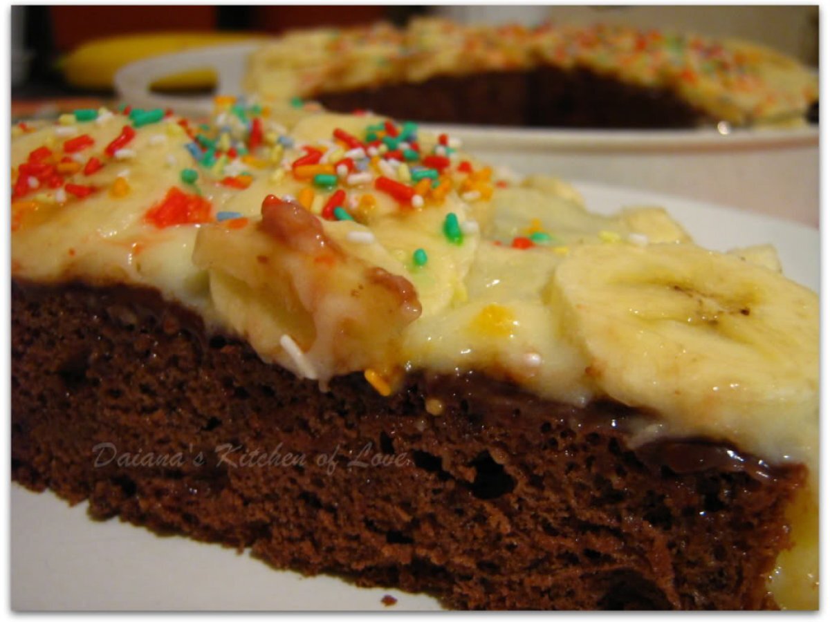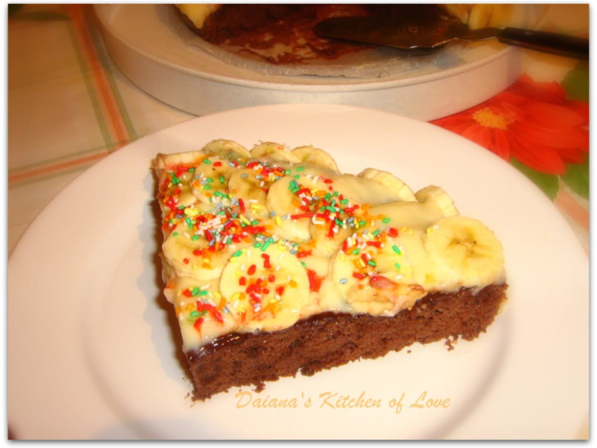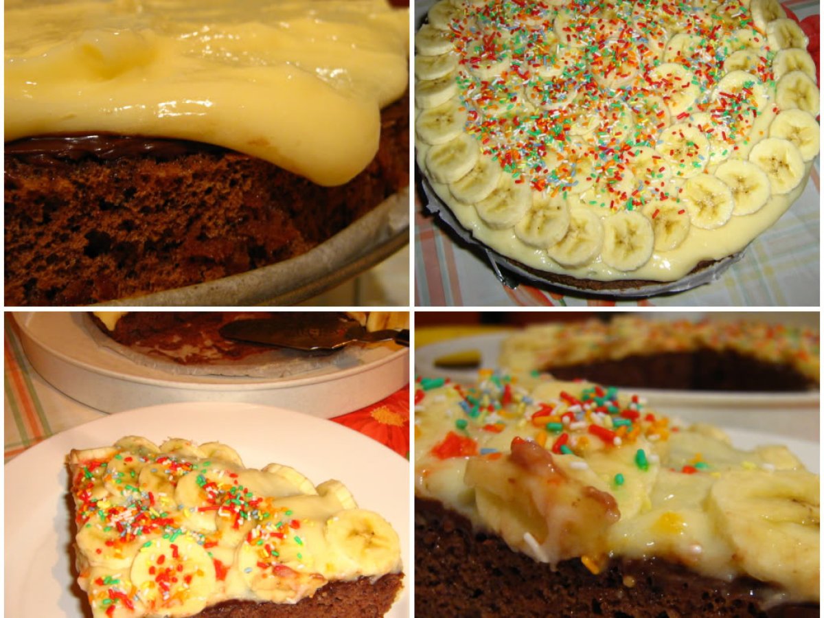 Tort de cacao cu crema de vanilie si banane PrecedentulUrmătorul DesertFoarte ușor55 min Trimite unui prieten Printează pagina Adresează o întrebare autorului Postează o poză cu rețeta gătită de tine Ingrediente 8 Blat: 5 oua 5 linguri de zahar 3 linguri de faina 2 linguri de cacao 2 pliculete zahar vanilat esenta de portocale Crema: 350 ml lapte 1 plic creme ole de vanilie cateva linguri de crema Nutoka 3 banane mai micute Sirop: 2-3 linguri de zahar 1 lingura esenta de portocale 1 lingura esenta de vanilie 1 fiola esenta de rom