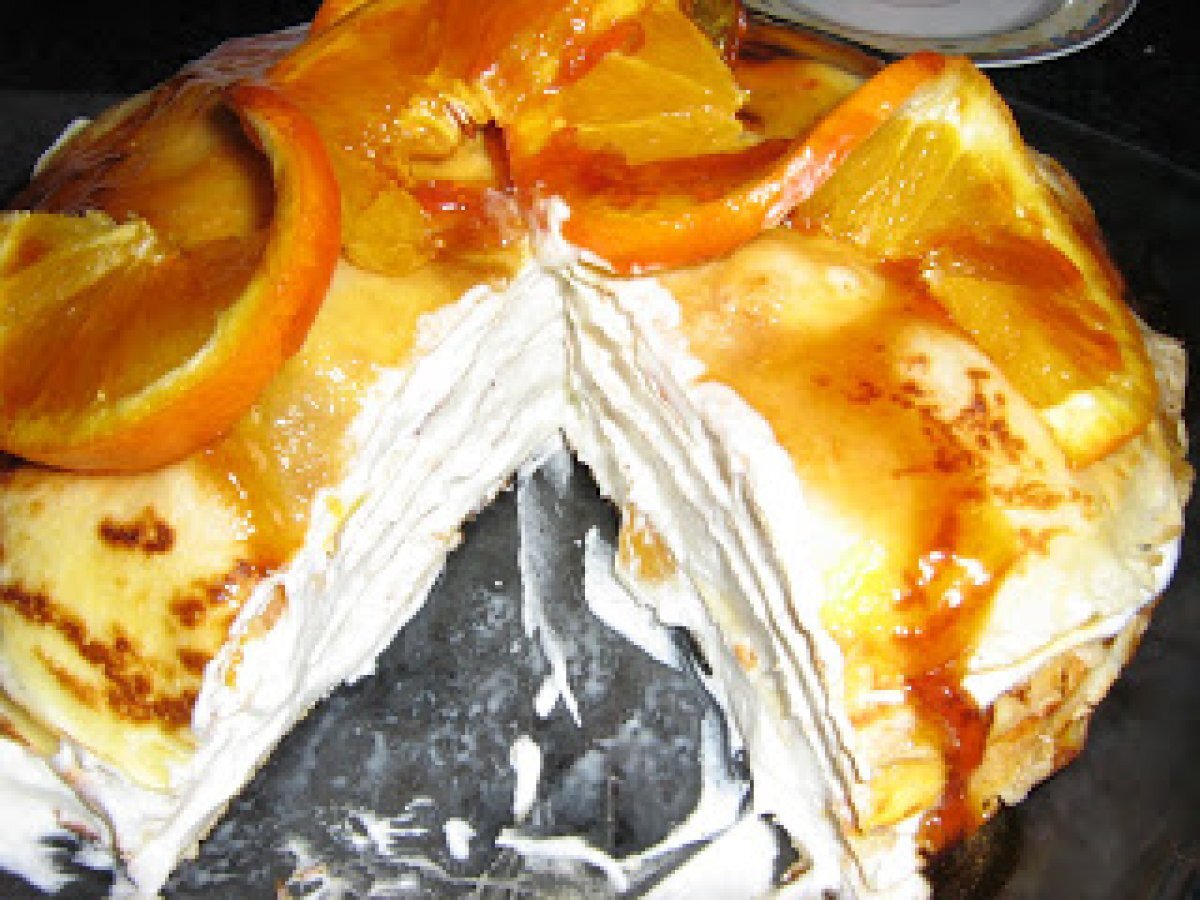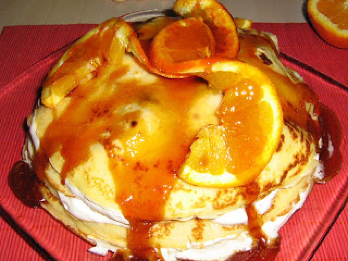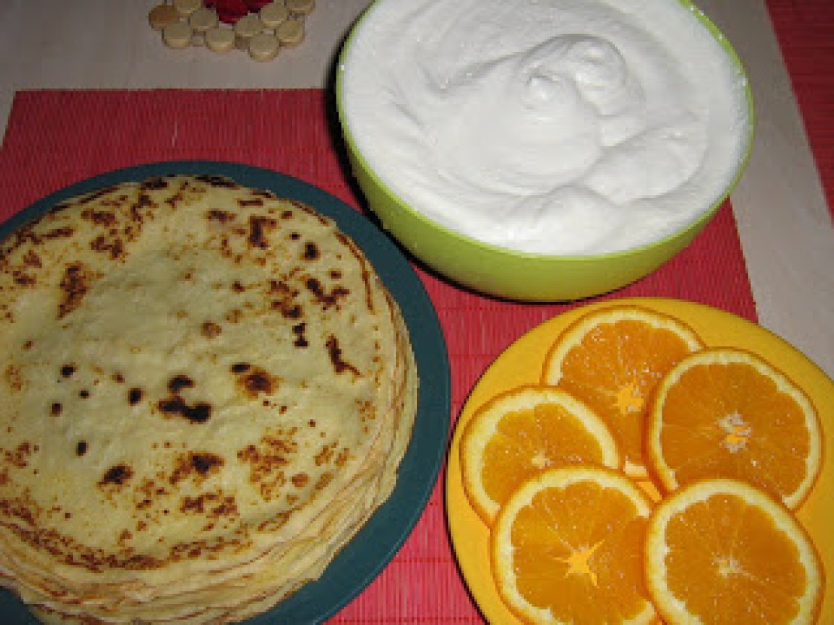 Tort de clatite cu portocale si sos caramel PrecedentulUrmătorul DesertFoarte ușor25 min Trimite unui prieten Printează pagina Adresează o întrebare autorului Postează o poză cu rețeta gătită de tine Ingrediente 2 100 g faina 2 oua 300 ml lapte 15 g unt topit ulei pentru prajit Pentru acest tortulet e nevoie de: 5-6 foi de clatite 400 ml frisca