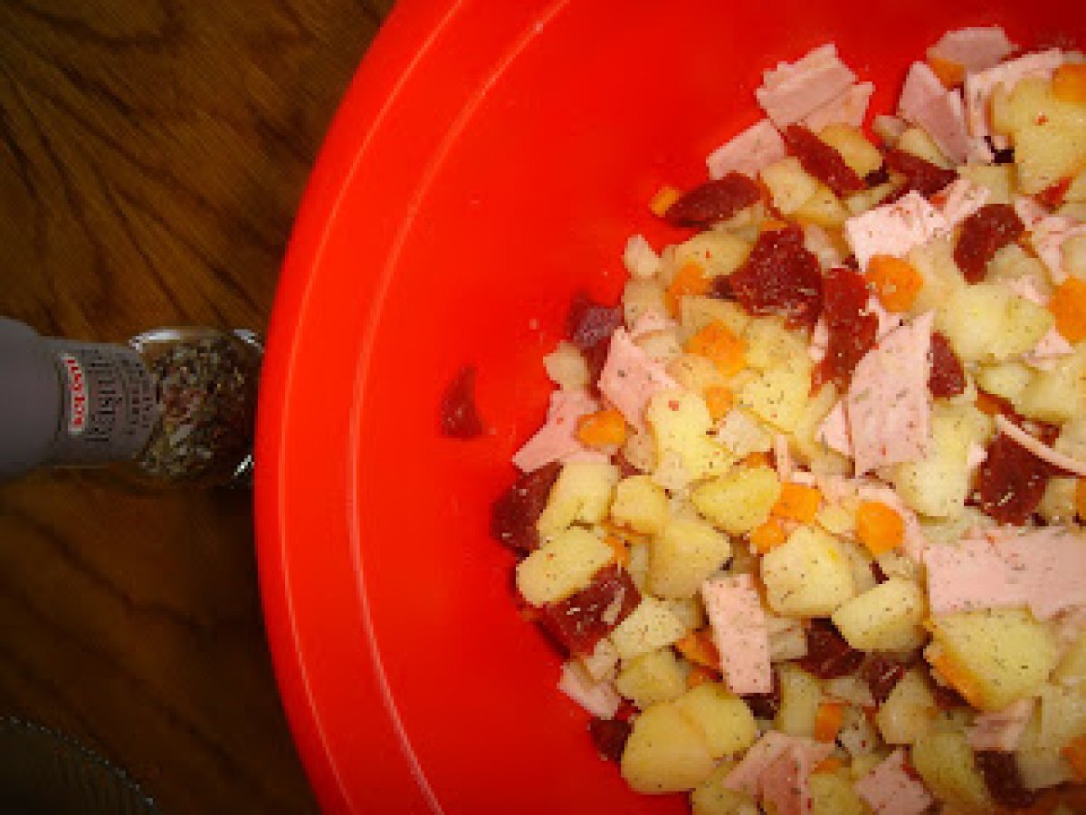 "tort" de salata cu rodie PrecedentulUrmătorul DesertFoarte ușor45 min Trimite unui prieten Printează pagina Adresează o întrebare autorului Postează o poză cu rețeta gătită de tine Ingrediente 4 4 cartofi, 300 g mortadella, 2 rodii, 200 g sfecla, 1 morcov, un sfert de telina, 1 pastarnac, 1 patrunjel, salata verde, maioneza, sare, piper.