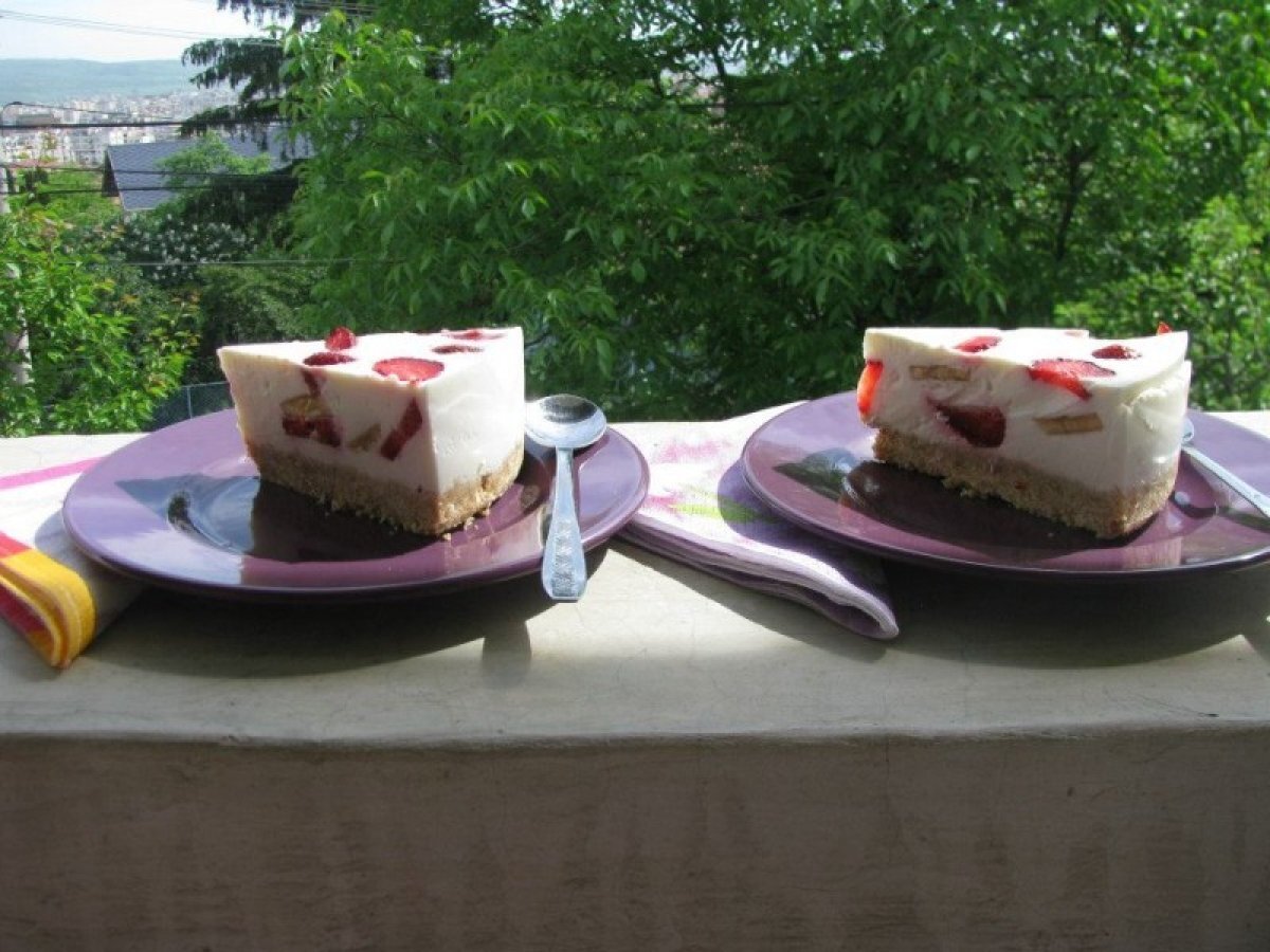 Tort de vara cu mascarpone si iaurt DesertUșor1 oră Trimite unui prieten Printează pagina Adresează o întrebare autorului Postează o poză cu rețeta gătită de tine Delicios! Ingrediente 8 350 de grame de biscuiti macinati 200 de grame de margarina 100 ml de lapte 200 de grame de zahar aroma de rom 250 de grame de mascarpone un iaurt mare capsuni 2 plicuri de gelatina