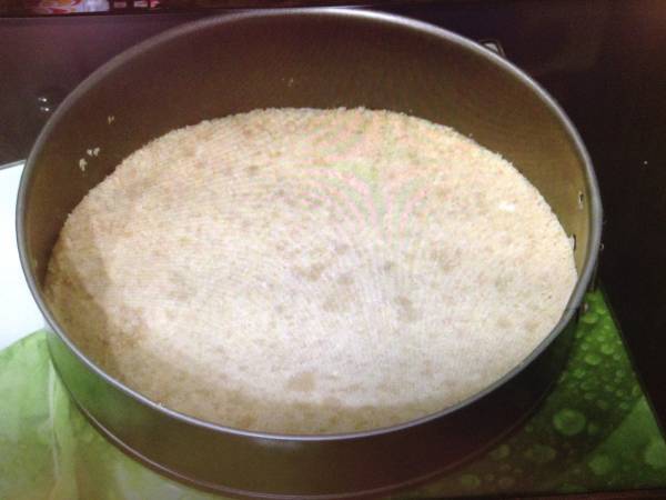 Pisati(macinati)cele 200g piscoturi,apoi amestecati-le cu 100g unt topit.Asezati aceasta compozitie de blat pe fundul unei forme de tort cu pereti detasabili si cu diametrul de 22cm.Tasati bine amestecul de piscoturi si unt formand astfel un blat.Bagati apoi forma in frigider pana pregatiti crema.