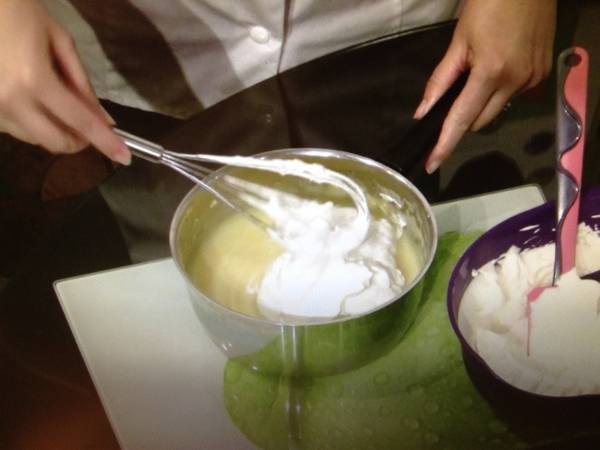 In momentul in care se amesteca frisca cu crema de budinca este foarte importanta temperatura acestora si anume frisca nu trebuie sa fie foarte rece iar crema trebuie sa fie aproape fierbinte,altfel crema pentru tort se va branzi adica se va taia.