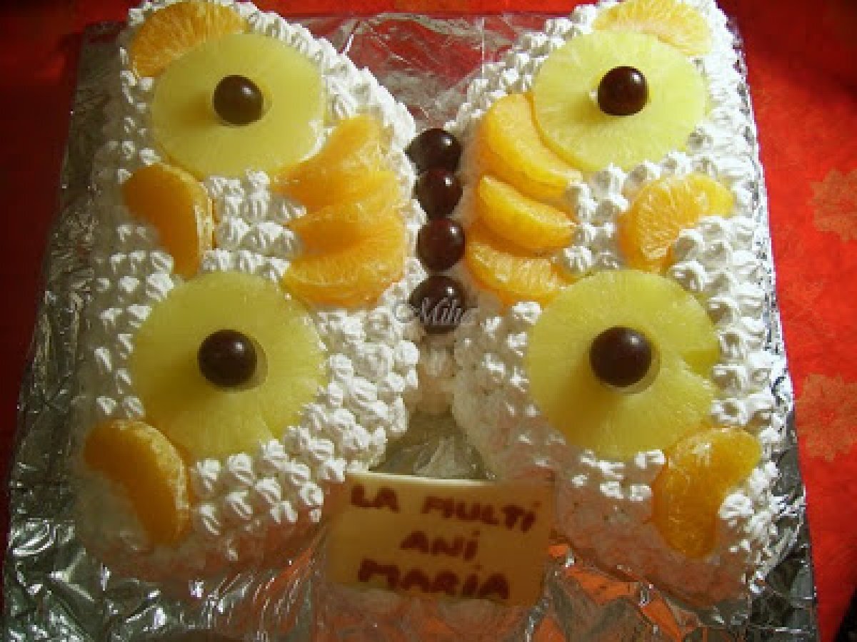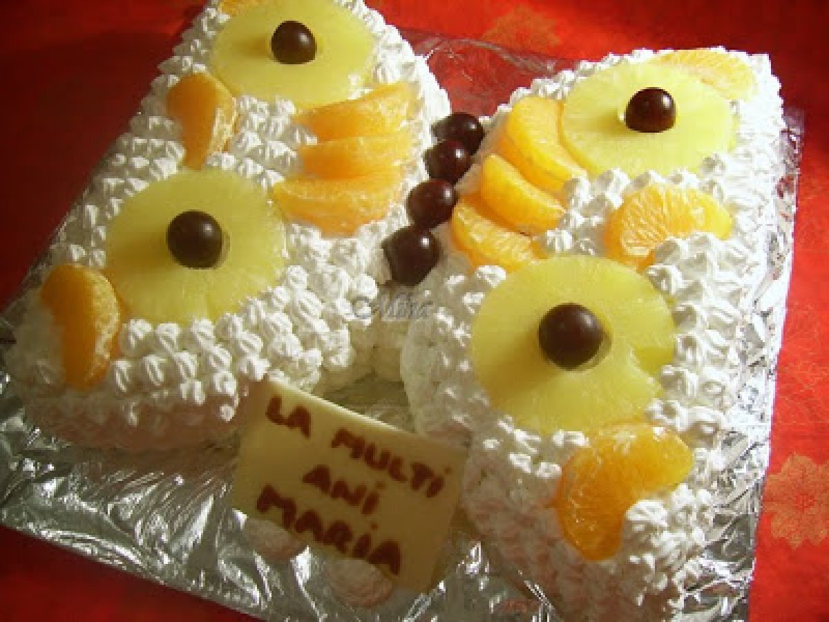 Tort diplomat - fluture PrecedentulUrmătorul DesertFoarte ușor1 oră Trimite unui prieten Printează pagina Adresează o întrebare autorului Postează o poză cu rețeta gătită de tine Ingrediente 4 Pentru blat: 5 oua 5 linguri zahar 3 linguri ulei 5 linguri faina esenta de vanilie 1 lingurita praf de copt Pentru crema: 5 galbenusuri 100 g zahar 220 ml lapte 1 litru de frisca lichida ( La Dorna) 30 g gelatina 1 cutie compot de ananas 3 mandarine
