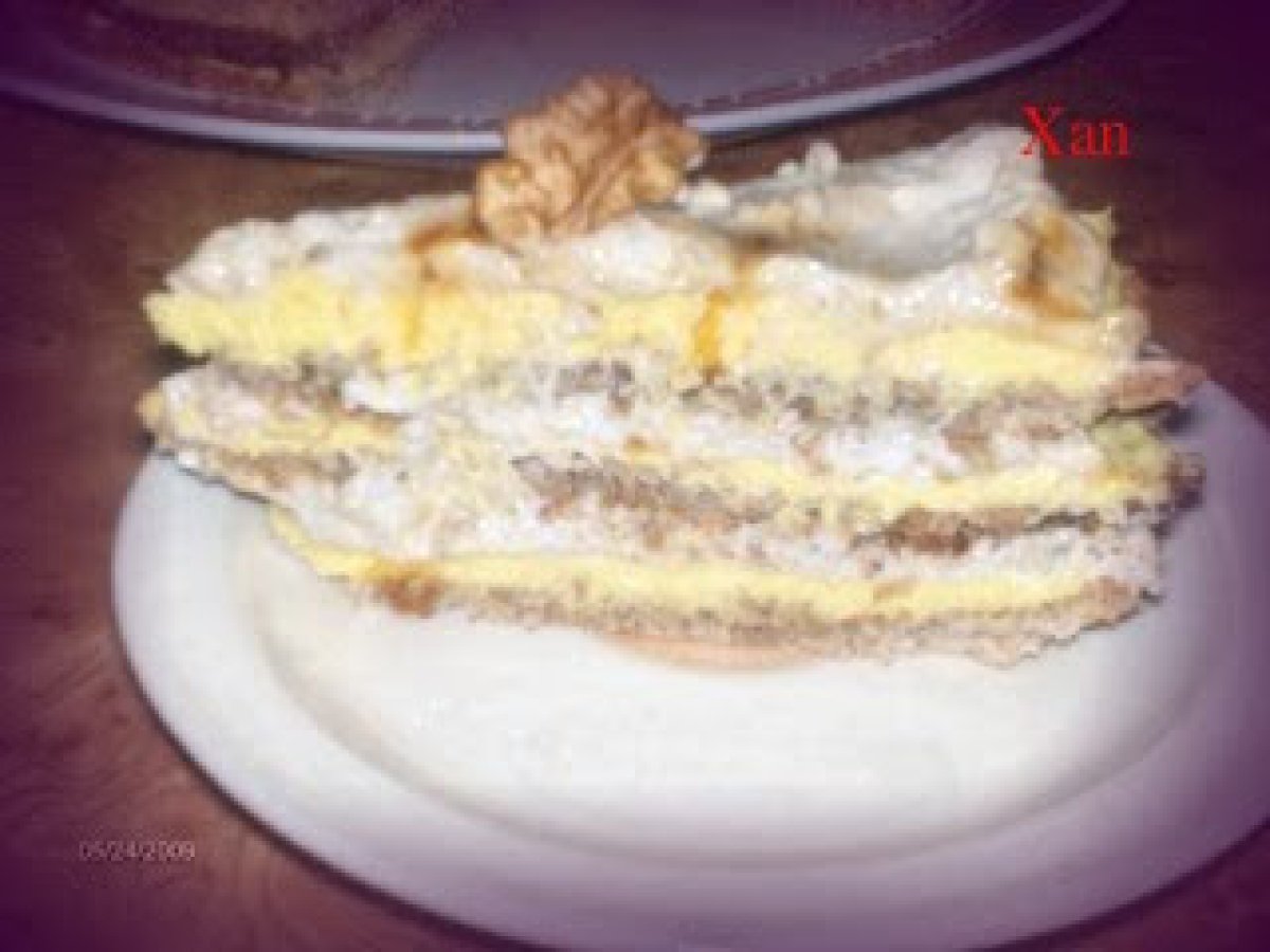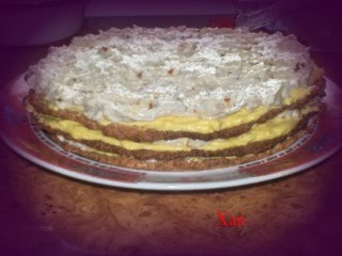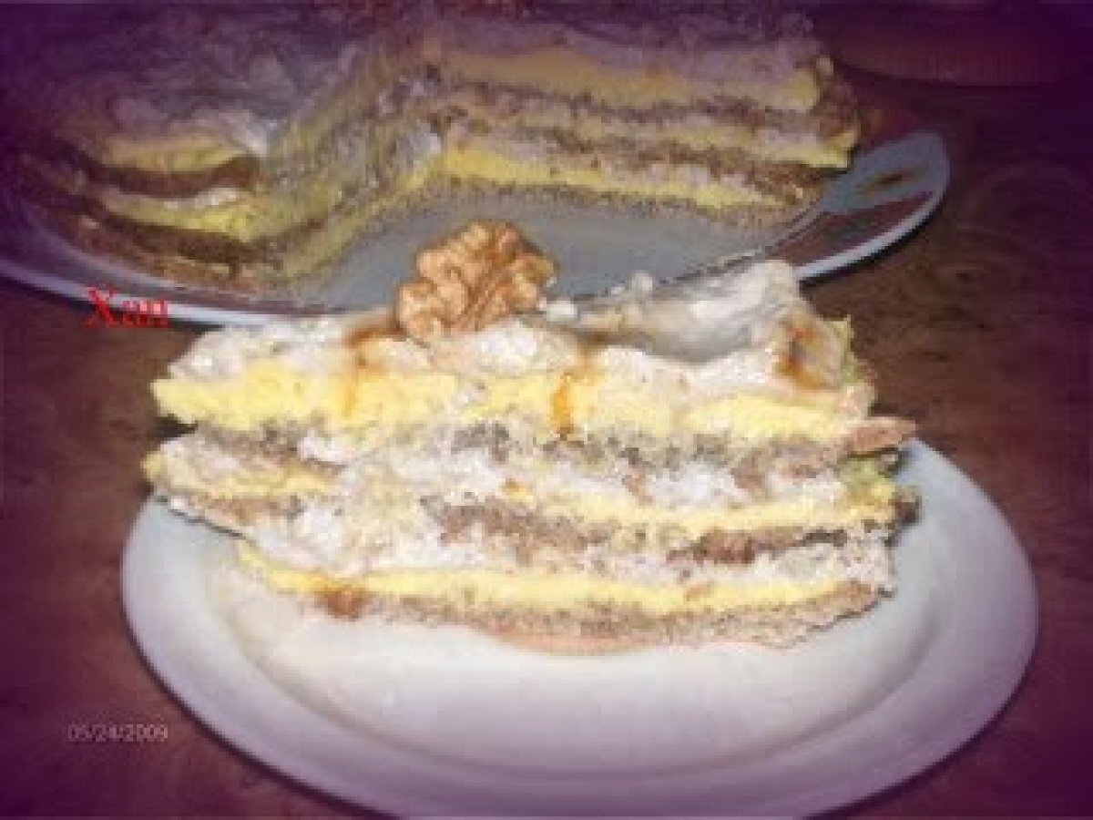 Tort egiptean by amalia (reteta testata) PrecedentulUrmătorul DesertFoarte ușor1 oră Trimite unui prieten Printează pagina Adresează o întrebare autorului Postează o poză cu rețeta gătită de tine Ingrediente 4 2 albusuri 2 linguri de zahar 1/2 lingura de faina 40 g alune macinate (se pot inlocui cu nuci). Pentru crema 1: 6 galbenusuri 6 linguri de zahar 340 ml lapte 2 linguri faina sau amidon 170 g unt, esenta de vanilie. Pentru crema 2: 200 ml frisca 150 g zahar 120 g alune zdrobite bucati mai mari