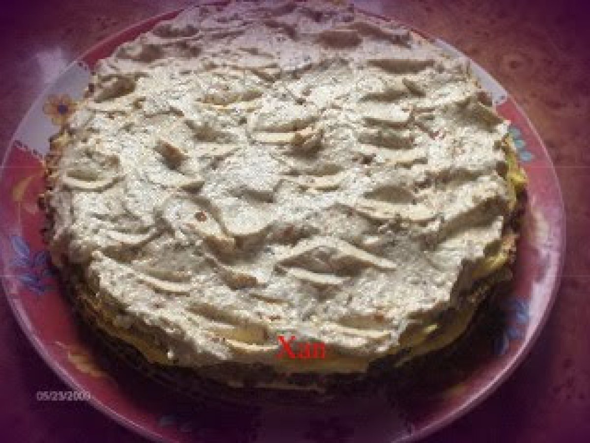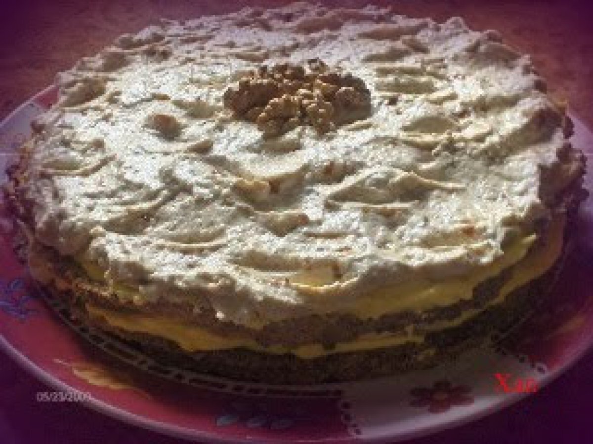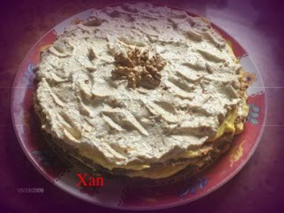 Tort egiptean by amalia (reteta testata) PrecedentulUrmătorul DesertFoarte ușor1 oră Trimite unui prieten Printează pagina Adresează o întrebare autorului Postează o poză cu rețeta gătită de tine Ingrediente 4 2 albusuri 2 linguri de zahar 1/2 lingura de faina 40 g alune macinate (se pot inlocui cu nuci). Pentru crema 1: 6 galbenusuri 6 linguri de zahar 340 ml lapte 2 linguri faina sau amidon 170 g unt, esenta de vanilie. Pentru crema 2: 200 ml frisca 150 g zahar 120 g alune zdrobite bucati mai mari