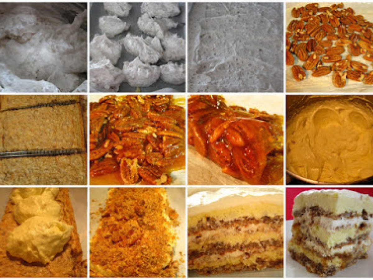 Tort egiptean PrecedentulUrmătorul DesertFoarte ușor1 h 10 m Trimite unui prieten Printează pagina Adresează o întrebare autorului Postează o poză cu rețeta gătită de tine Ingrediente 6 8-10 albusuri 8-10 linguri de zahar 1 lingura de faina 60-70 g alune de padure/nuci/migdale macinate 10 galbenusuri 10 linguri de zahar 4 linguri de amidon 2 plicuri de zahar vanilat sau o lingurita extract de vanilie 500 ml lapte 170 g unt 150 g nuci/alune coapte 200 g zahar 350 g- 400 frisca 1 plic intaritor de frisca