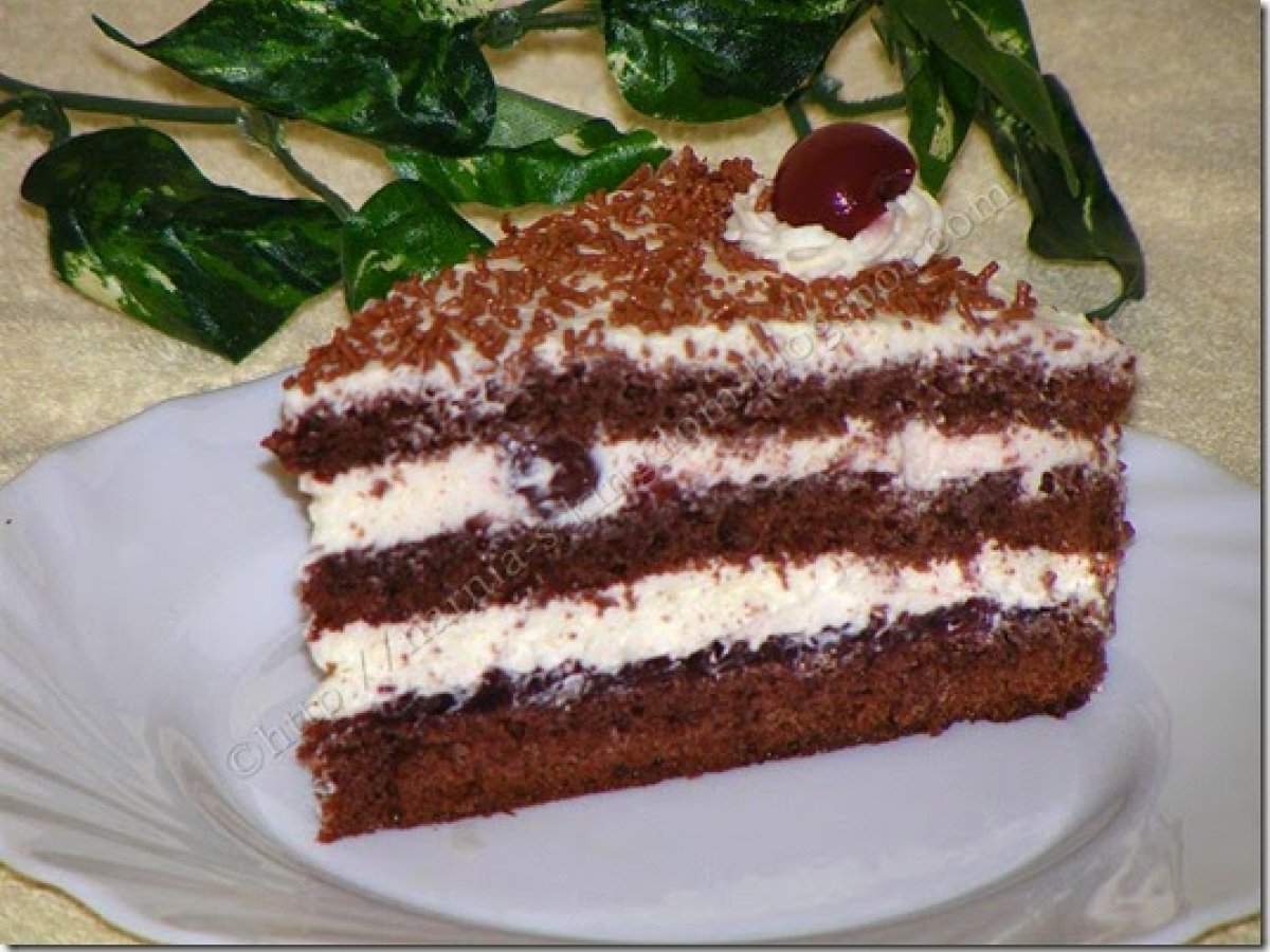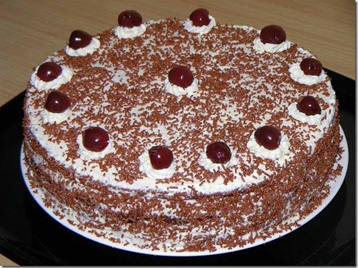 Tort foret noire ( padurea neagra) PrecedentulUrmătorul DesertFoarte ușor1 h 40 m Trimite unui prieten Printează pagina Adresează o întrebare autorului Postează o poză cu rețeta gătită de tine Ingrediente 4 6 oua 6 linguri lapte ( sau apa) 200 g faina 250 g zahar o jumatate de plic de praf de copt o fiola de esenta de vanilie 50 g cacao Pentru jeleul de visine am folosit: un borcan mare de compot de visine fara samburi 20 ml tuica prune 4 foi de gelatina