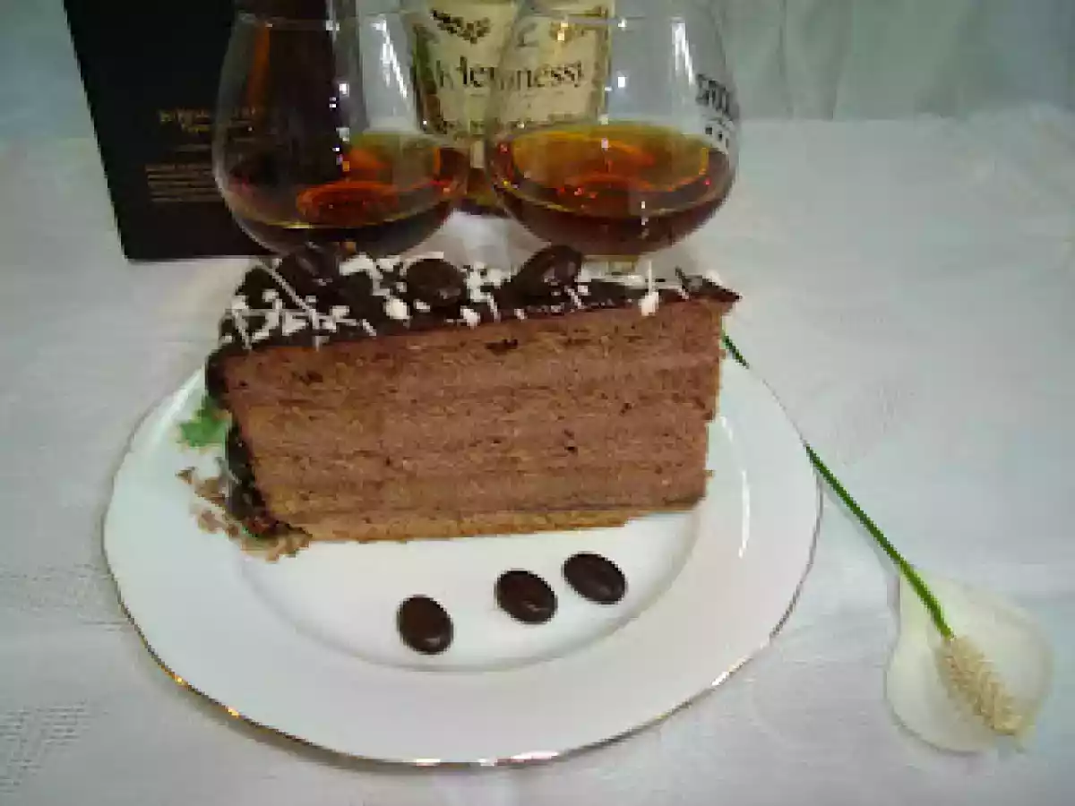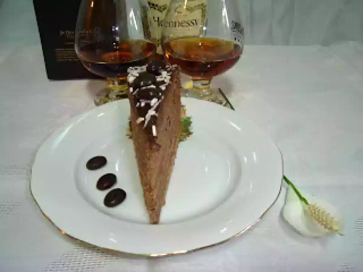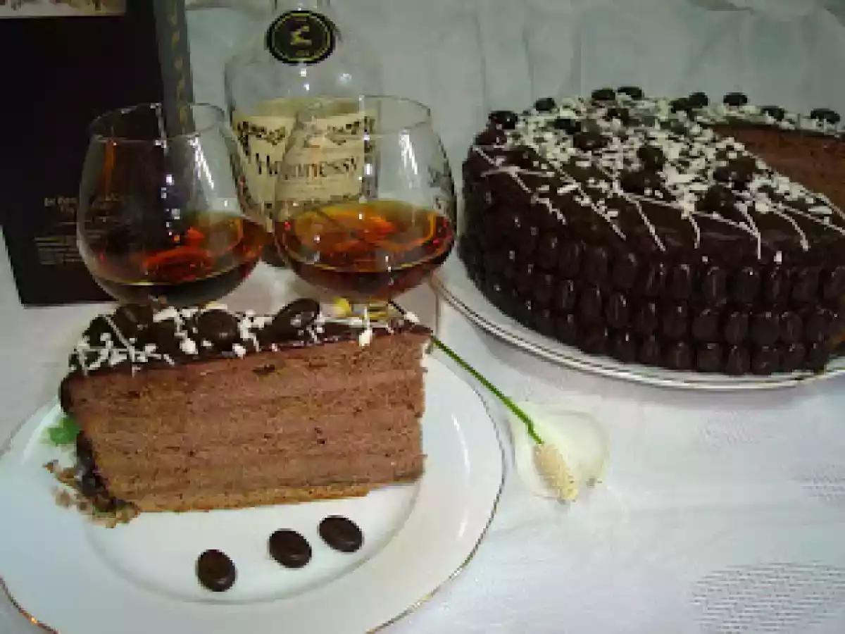 Tort hennessy/hennessy's cake PrecedentulUrmătorul DesertUșor2 h 15 m Trimite unui prieten Printează pagina Adresează o întrebare autorului Postează o poză cu rețeta gătită de tine Ingrediente 8 Ingrediente pt. blat: 8 oua 1 cana de zahar 100 ml cafea concentrata 200 g unt 2 cani de faina 1 plic praf de copt 1 esenta de rom. Ingrdiente pt. insiropat: o cafea espresso 3 linguri de zahar 1 lingura lapte pudra pt. cafea 2 linguri de coniac Hennessy. Ingrediente pt. crema: 150 ml coniac Hennessy 3 oua 100 g faina 4 linguri cu zahar pudra 50 g ciocolata 250 g unt 100 g cacao 300 ml lapte. Ingrediente pt. glazura: 200 g ciocolata amaruie 200 g zahar 100 ml cafea concentrata Ingrediente pt. ornat: un tub de glazura alba Dr. Oetker ciocolata alba maruntita 1 pachet boabe de cafea de ciocolata amaruie. 100 g unt