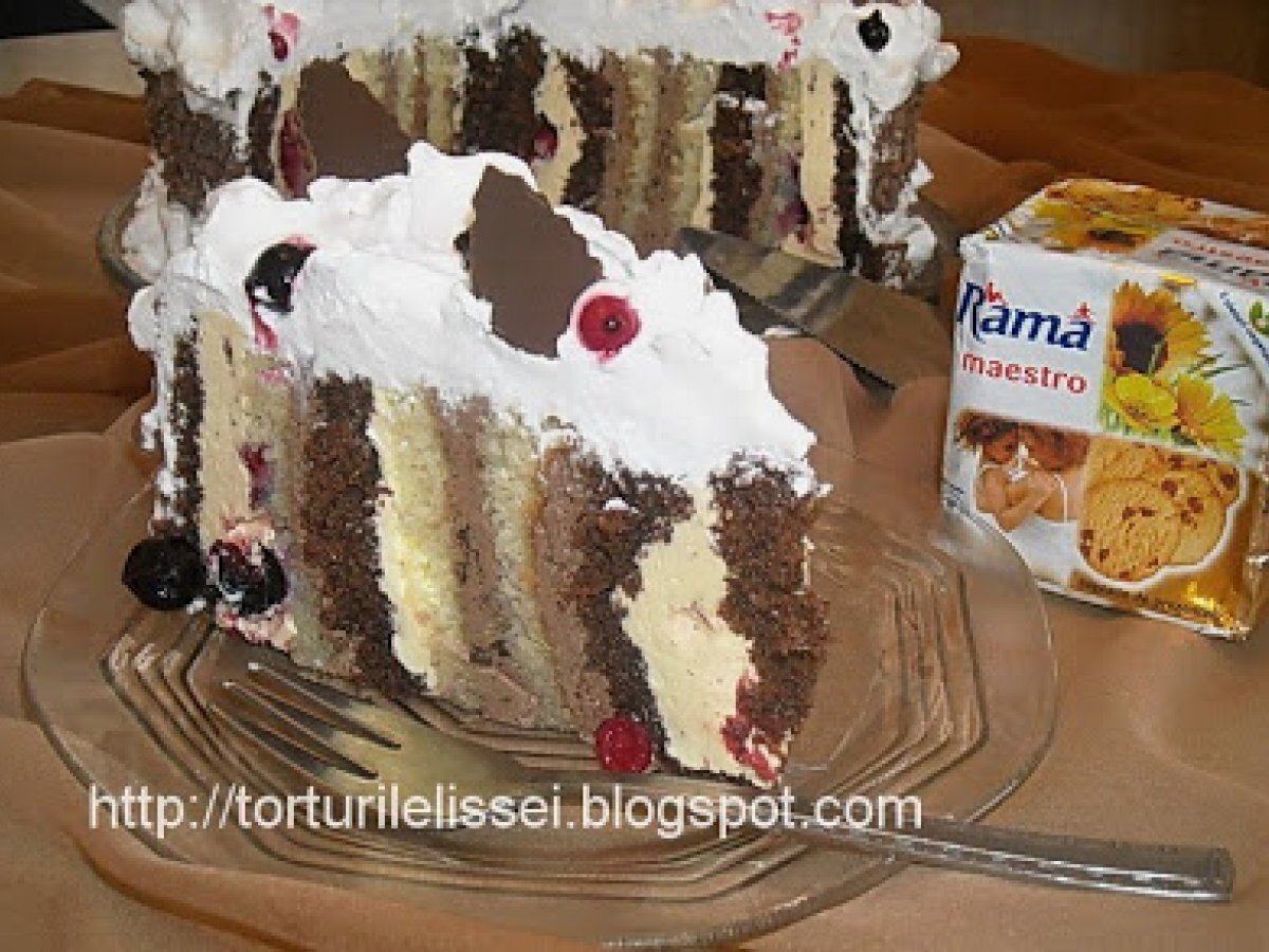 Tort magnas PrecedentulUrmătorul DesertFoarte ușor55 min Trimite unui prieten Printează pagina Adresează o întrebare autorului Postează o poză cu rețeta gătită de tine Ingrediente 8 Pentru blat maro: 5 oua , 100 g zahar , 50 g nuci prajite si macinate , 50 g faina ,20 g cacao. Se procedeaza ca la primul blat , punand o data cu faina,nucile si cacaua. Cele doua blaturi gata coapte. Pentru crema avem nevoie de: 4 oua , 200 g zahar, 2 cuburi margarina Rama (500 g), 1 lg cacao , zahar vanilat, fructe de padure .