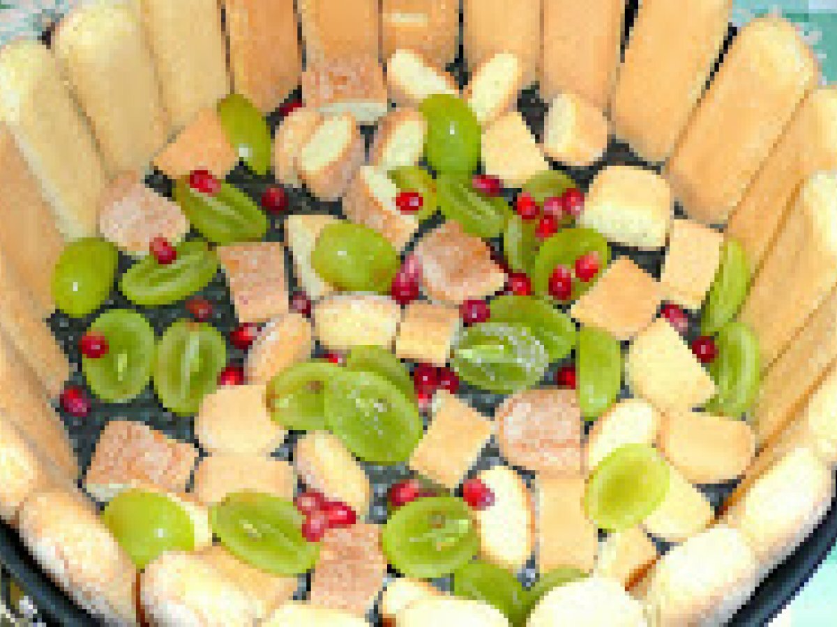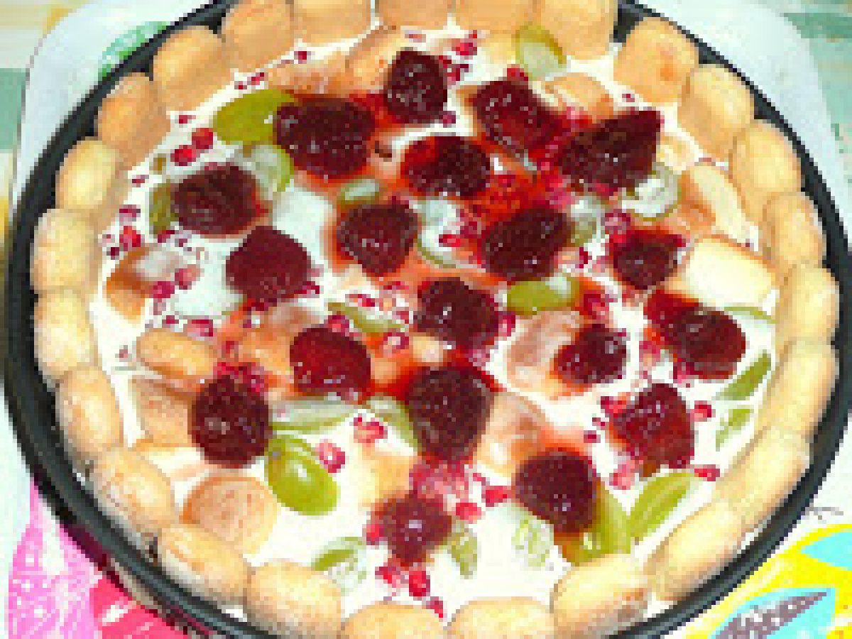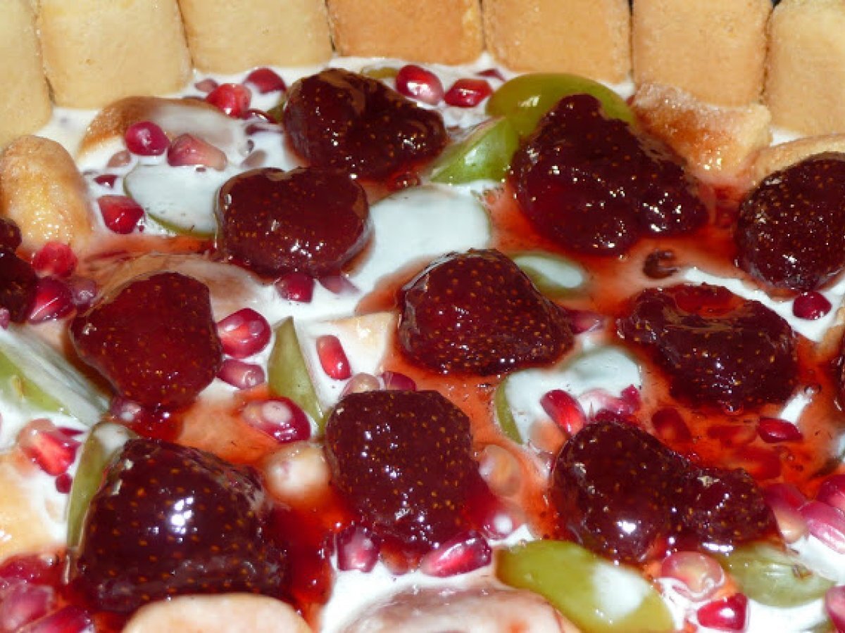 Tort panacotta cu struguri, rodie si capsuni PrecedentulUrmătorul DesertFoarte ușor40 min Trimite unui prieten Printează pagina Adresează o întrebare autorului Postează o poză cu rețeta gătită de tine Ingrediente 4 un pachet de piscoturi 2 l smantana dulce 500 g zahar pudra (sau mai putin, in functie de gust) 4 plicuri zahar vanilinat 4 plicuri gelatina o rodie 1/2 kg struguri capsuni din gem