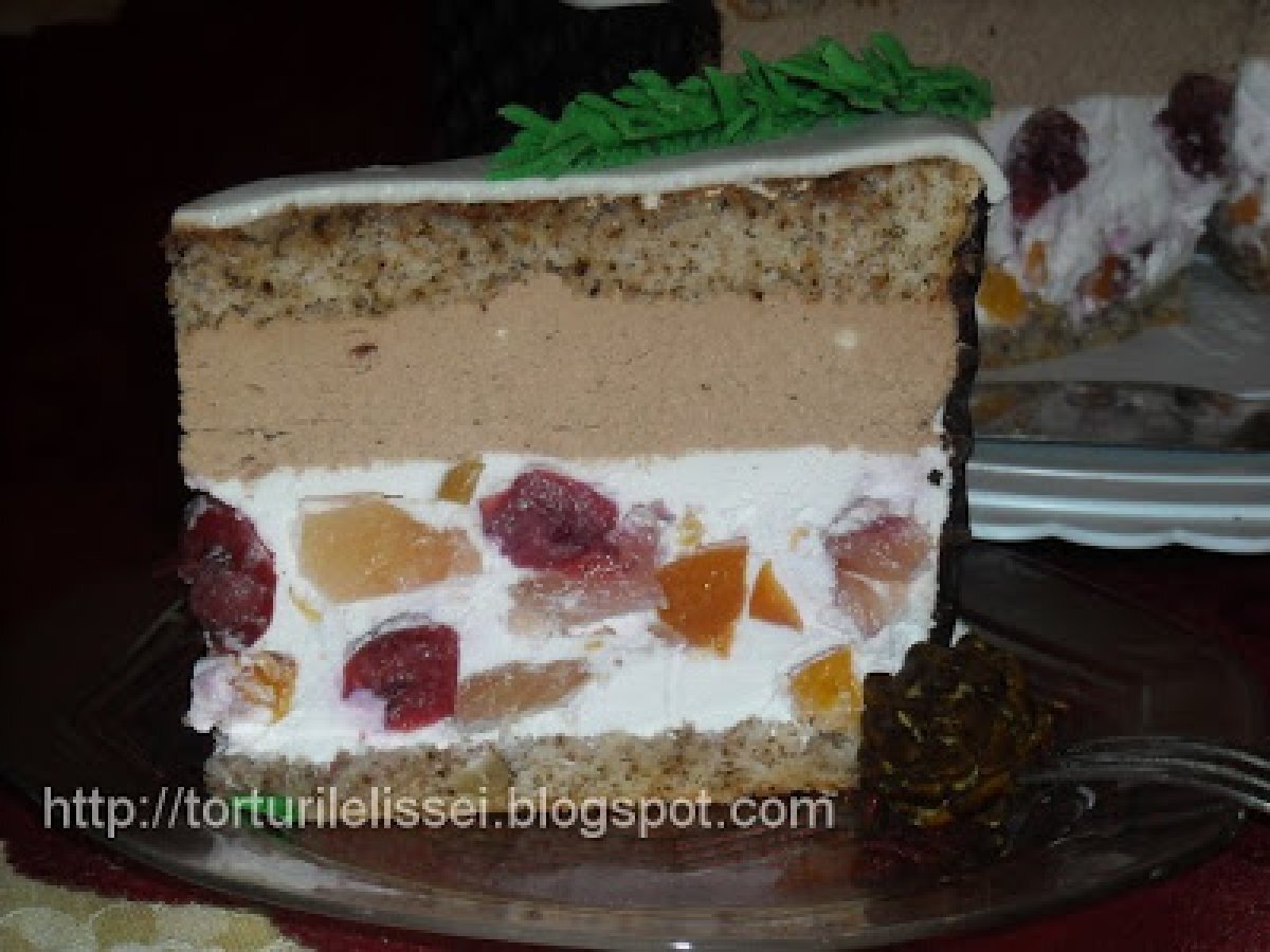Tort revelion 2011 PrecedentulUrmătorul DesertFoarte ușor55 min Trimite unui prieten Printează pagina Adresează o întrebare autorului Postează o poză cu rețeta gătită de tine Ingrediente 8 Pentru blat : 3 oua , 3 lg apa, 150 g zahar, 50 g amidon , 50 g nuci prajite si macinate, 75 g faina, 1 lingurita rasa praf de copt. Crema cu fructe: 500 g fructe din compot 400 ml frisca , 2 lg zahar, esenta de vanilie 200 ml suc din compot. 20 g gelatina. Peste crema cu fructe am pus a doua crema: 250 g mascarpone , 400 ml frisca , 200 g ciocolata, 10 g gelatina , esenta de rom.