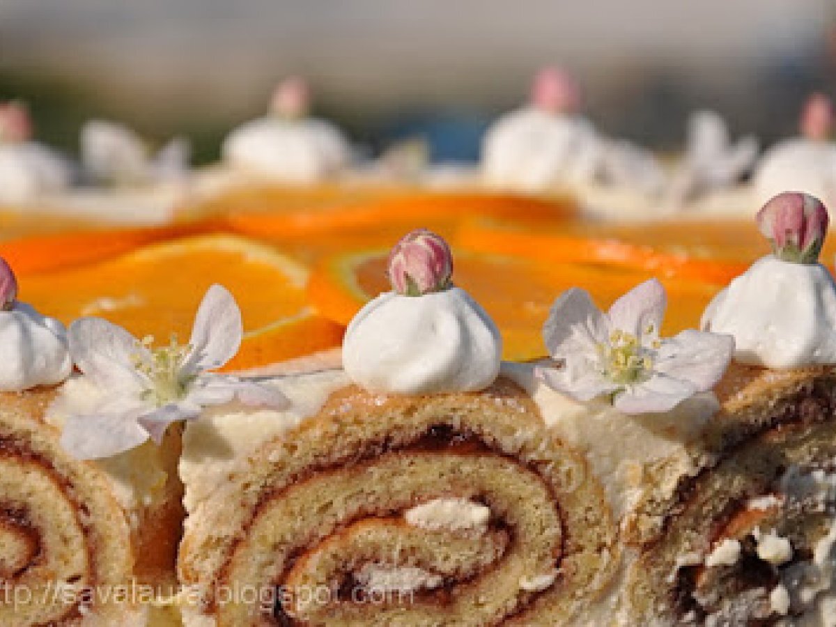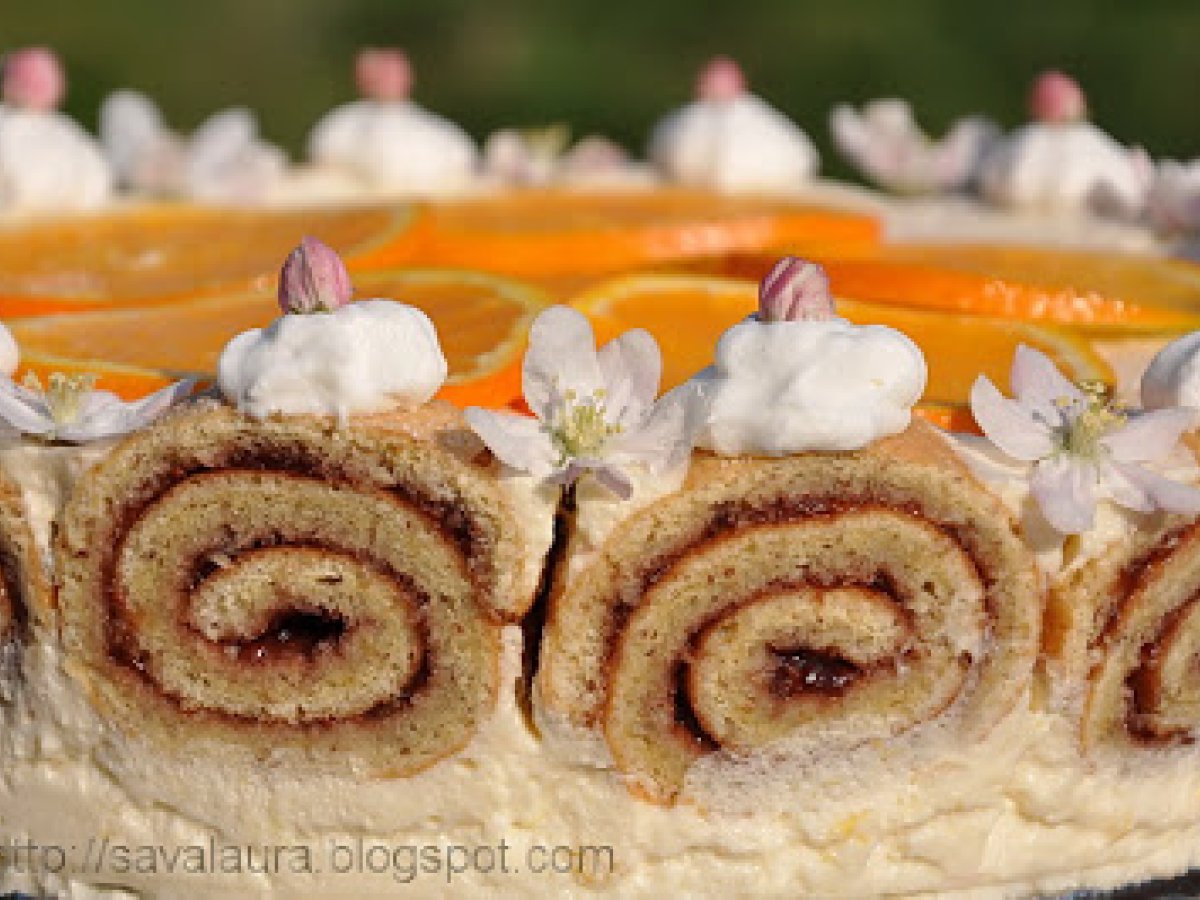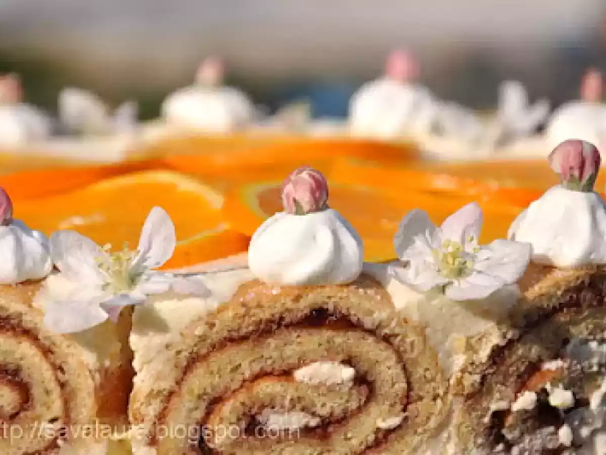 Tort-rulada cu crema de iaurt si portocale PrecedentulUrmătorul DesertUșor1 h 5 m Trimite unui prieten Printează pagina Adresează o întrebare autorului Postează o poză cu rețeta gătită de tine Ingrediente 10 Pentru rulada: 4 oua 3 linguri apa rece 80 g. zahar 70 g. faina 50 g. migdale macinate cateva picaturi esenta portocale 50 g. coaja de portocala glasata 150 g. gem zmeura Pentru blat: pandispan din 3 oua suc proaspat de portocale pentru insiropat Pentru crema: 5 portocale 1 lamaie 100 g. zahar 15 g. gelatina 300 g. iaurt cremos 400 ml. frisca Pentru ornat: 1 portocala mare, taiata felii 100 ml. frisca flori de mar