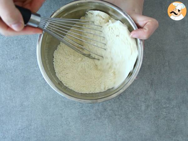 Preincalziti cuptorul la 200° C. Topiti ciocolata cu untul. Se amesteca pudra de migdale cu zaharul pudra.