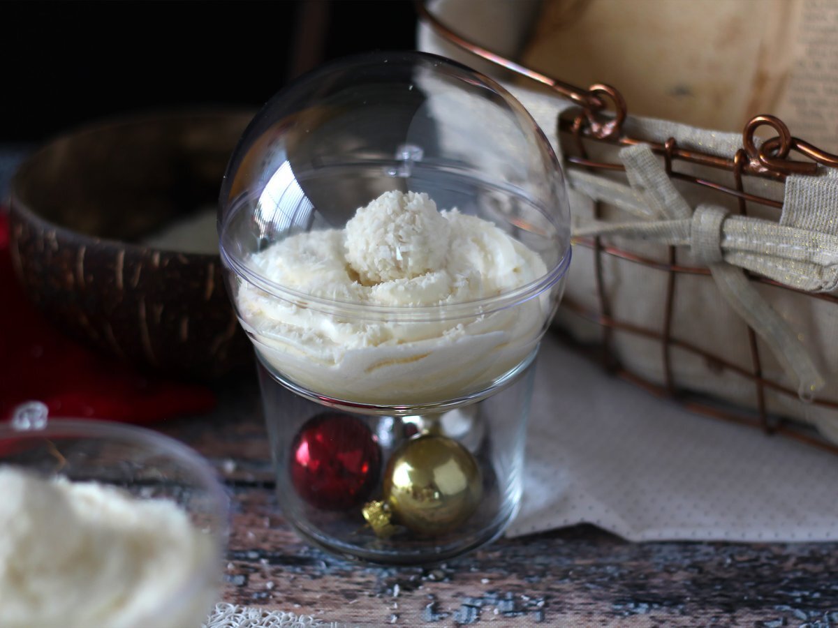 Puneți ganache pe fundul globurilor transparente. Adăugați un strat de mousse de nucă de cocos.