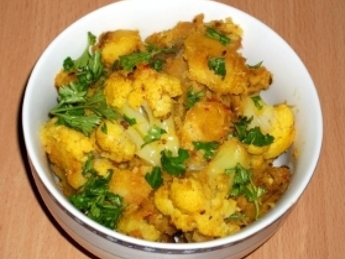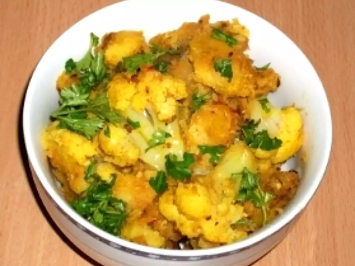 Aloo gobi (cartofi cu conopida) Felul principalUșor30 min Trimite unui prieten Printează pagina Adresează o întrebare autorului Postează o poză cu rețeta gătită de tine Ingrediente 4 1 conopida medie 4 cartofi medii 1 ceapa mica 1 chilli rosu proaspat 1 bucatica ghimbir proaspat de aprox. 2 cm 1 lingurita chimen seminte 1 lingurita coriandru macinat 1/2 lingurita turmeric 1 lingurita Garam Masala (optional) 4 linguri ulei 1/3 cana apa 1/2 lingurita sare 1 legatura patrunjel verde