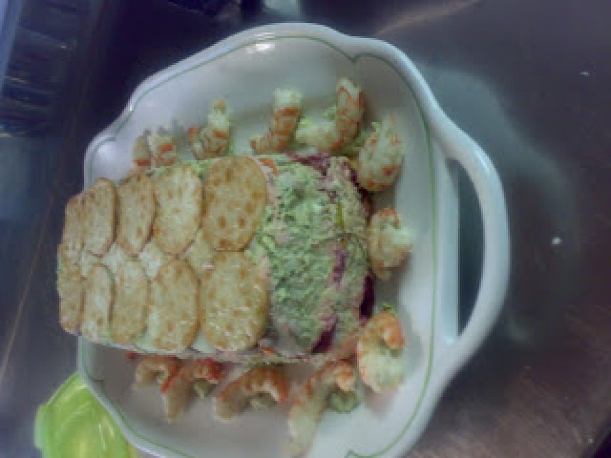 Aperitiv in straturi cu peste si legume PrecedentulUrmătorul Felul principalFoarte ușor1 h 5 m Trimite unui prieten Printează pagina Adresează o întrebare autorului Postează o poză cu rețeta gătită de tine Ingrediente 6 pt decor:creveti Legume:cartofi,morcovi,sfecla rosie Pt salsa : Patrunjel,capere,seminte de pin, paine inmuiata in otet usturoi un catel 2 oua fierte tari hamsii sarate,maioneza