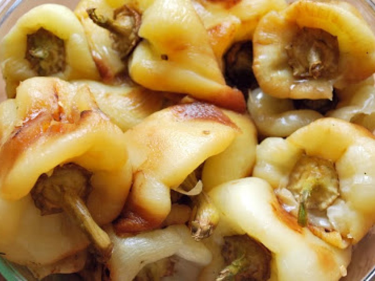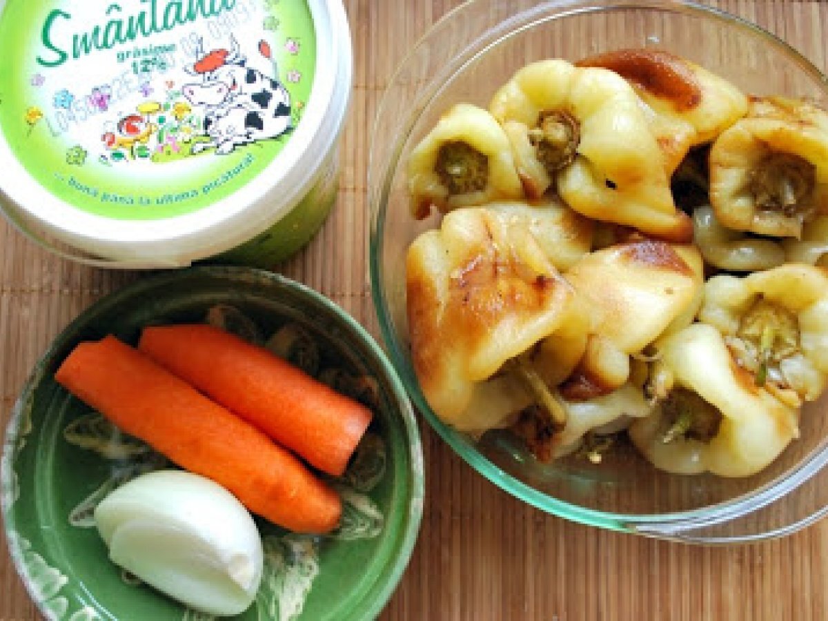 Ardei cu smantana- tare buuni! :d PrecedentulUrmătorul Felul principalFoarte ușor40 min Trimite unui prieten Printează pagina Adresează o întrebare autorului Postează o poză cu rețeta gătită de tine Ingrediente 2 aprox 1 kg. ardei grasi cei buni pt copt sunt grosi la doaga 700-800 g. smantana 2 linguri de faina 1 ceapa potrivita 1 morcov vegeta piper verdeata pt decor