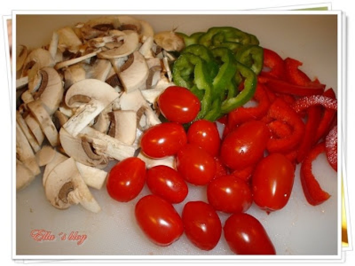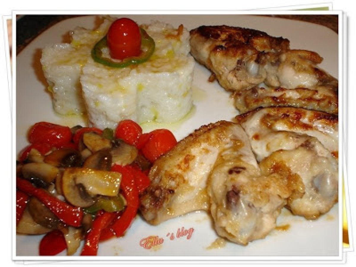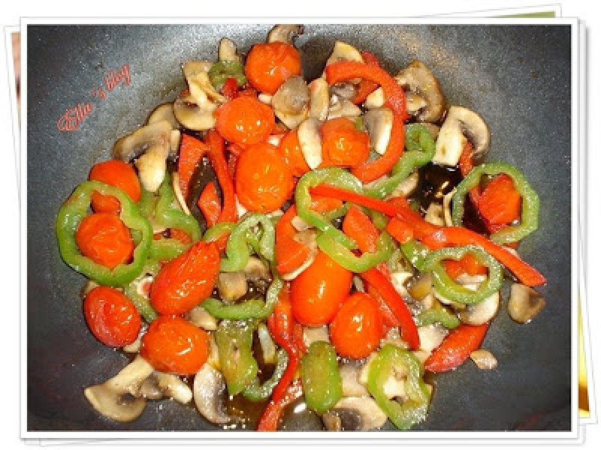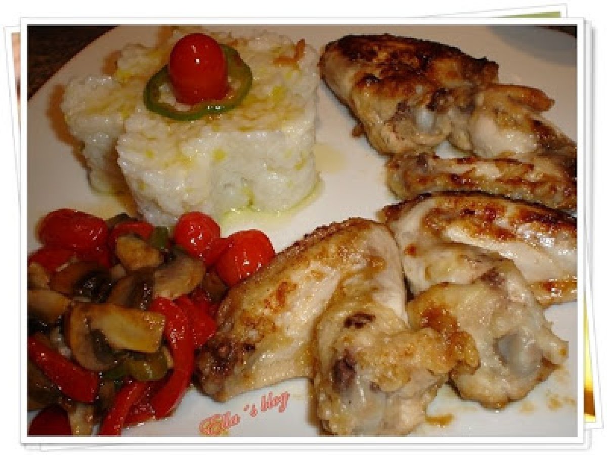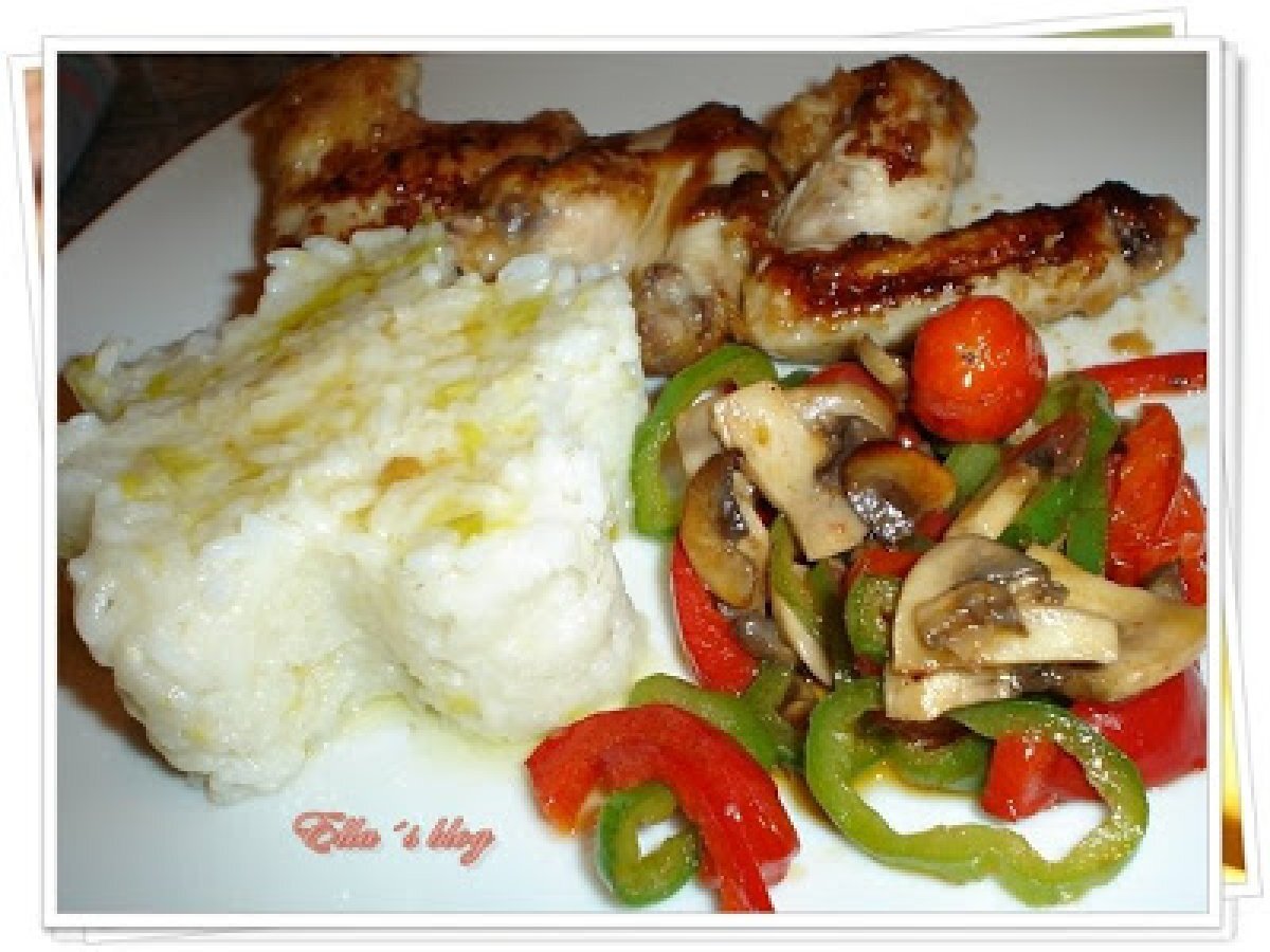 Aripi de pui cu sos de soia si legume PrecedentulUrmătorul Felul principalFoarte ușor1 oră Trimite unui prieten Printează pagina Adresează o întrebare autorului Postează o poză cu rețeta gătită de tine Ingrediente 2 10 aripi de pui 3 linguri de sos de soia 100 ml ulei de masline 50 g faina 10 tomate cherry 1/2 ardei verde 1/2 ardei rosu 3-4 ciuperci sare