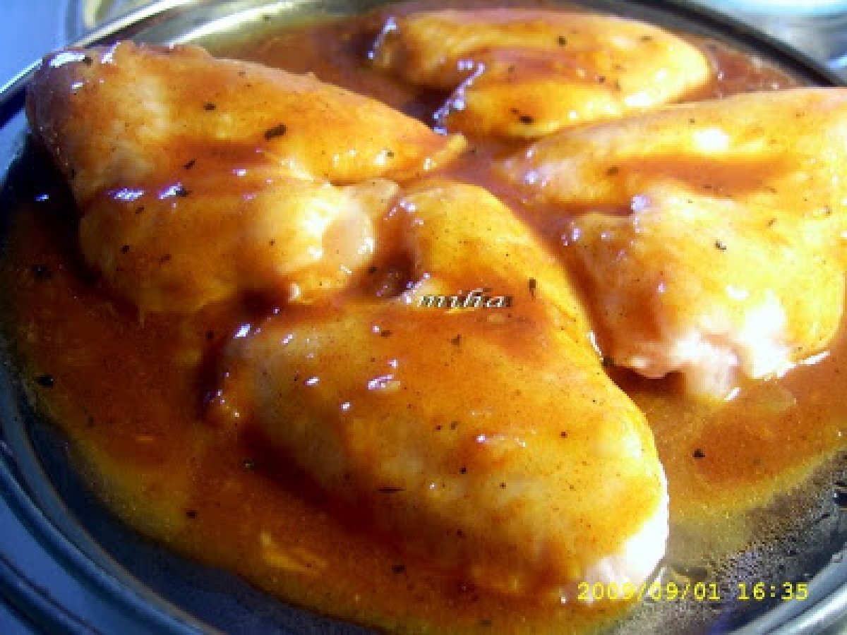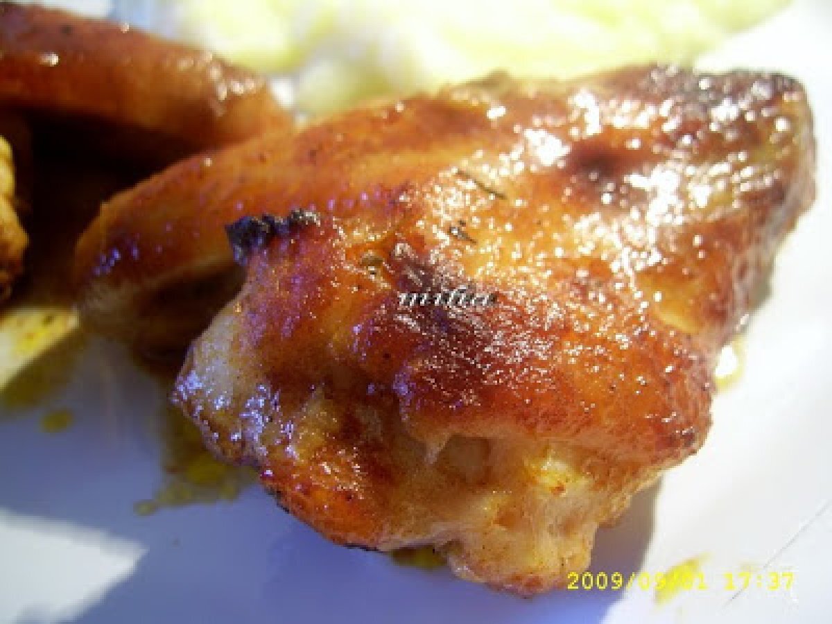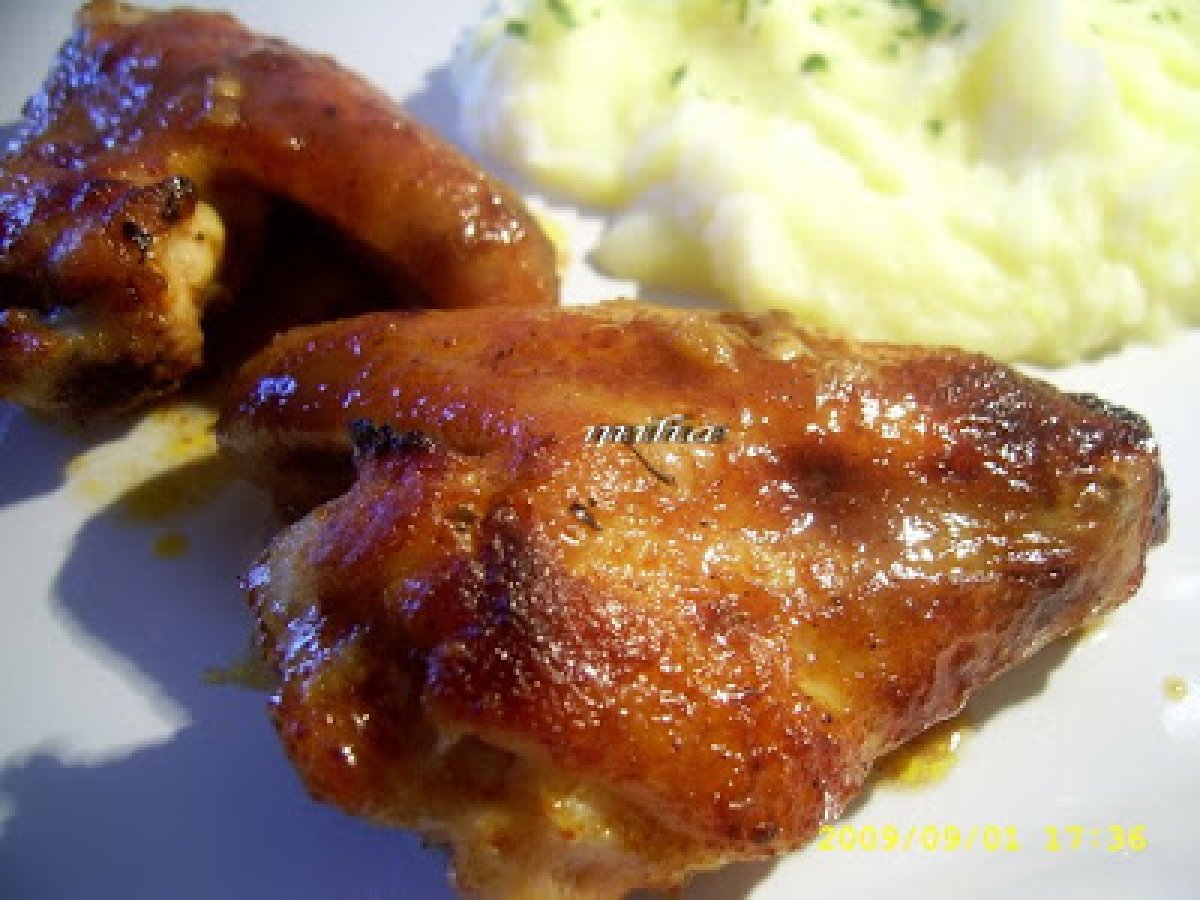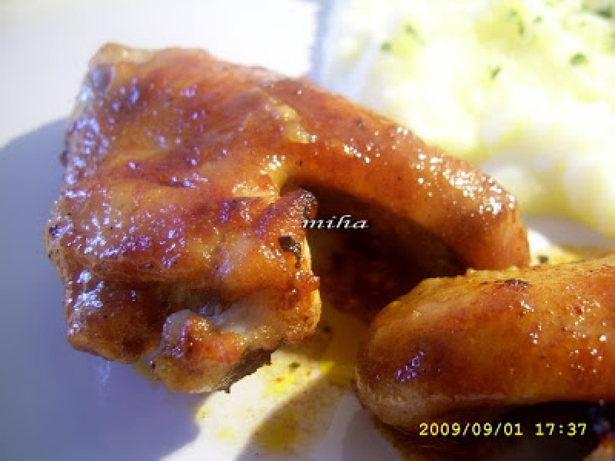Aripioare de pui la capac PrecedentulUrmătorul Felul principalFoarte ușor50 min Trimite unui prieten Printează pagina Adresează o întrebare autorului Postează o poză cu rețeta gătită de tine Ingrediente 2 4 aripioare de pui 50 g unt 1 lingura miere 3 linguri suc de rosii 2 catei usturoi 1 lingurita boia de ardei 1/2 lingurita nucsoara 1/2 lingurita rozmarin sare si piper