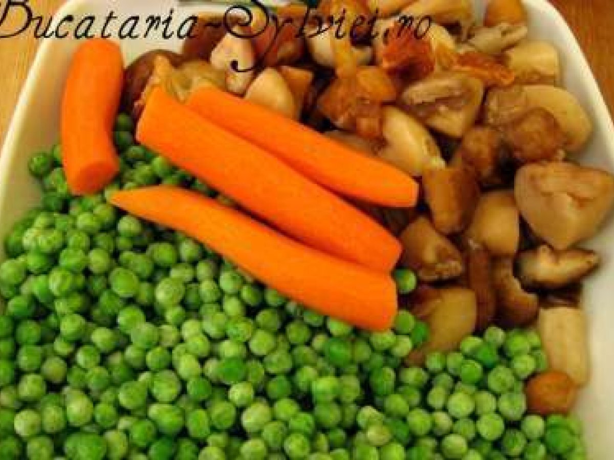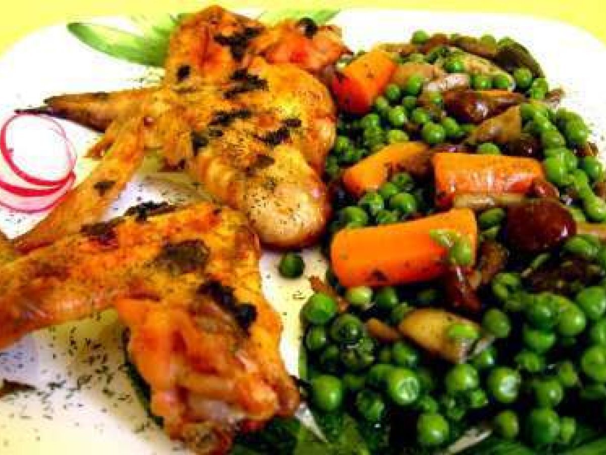 Aripioare la cuptor cu legume PrecedentulUrmătorul Felul principalFoarte ușor45 min Trimite unui prieten Printează pagina Adresează o întrebare autorului Postează o poză cu rețeta gătită de tine Ingrediente 3 Pentru 2-3 portii avem nevoie de : 7-8 aripioare de pui, 50ml ulei, 50 ml vin alb, 50 ml apa, o lingura de sos de soia, un catel de usturoi, boia, sare, piper, verdeata maruntita ( patrunjel, telina si salvie verde am pus eu ). Legume : 300 grame de mazare verde, 4 morcovi medii, 250 grame ciuperci forestiere asortate ( galbiori, ghebe, champinioane o lingura ulei de masline, sare, piper.