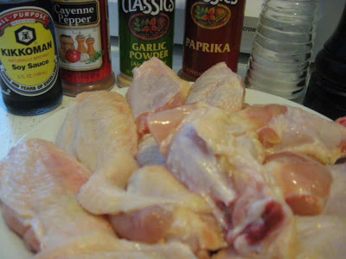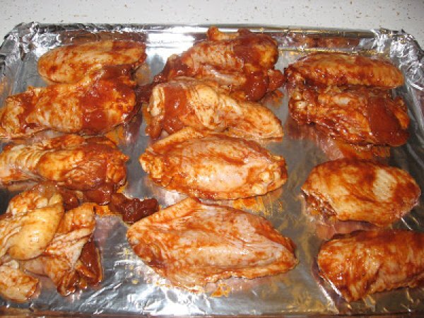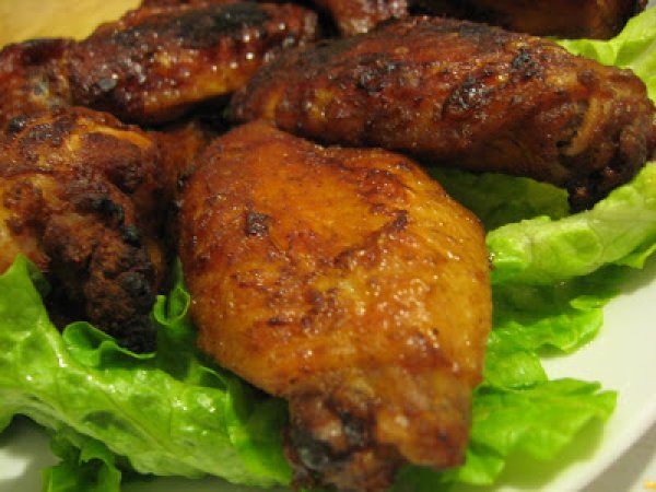 - Aripioarele se dau cu sare si piper. Restul ingredientelor se amesteca si se pun intr-o punga cu fermoar, si se adauga aripioarele peste. Se maseaza punga, asa incat toate aripioarele sa fie acoperite cu marinata, si se pun la frigider 1-2 ore, chiar mai mult.