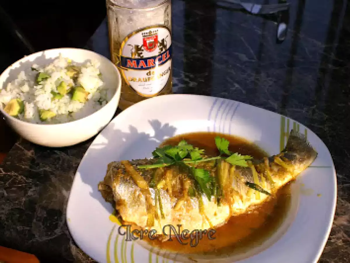 Biban de mare cu sos de bere si orez cu avogado Felul principalFoarte ușor40 min Trimite unui prieten Printează pagina Adresează o întrebare autorului Postează o poză cu rețeta gătită de tine Ingrediente 4 2 bibani de mare a cate aprox. 300 g fiecare 5 cm ghimbir taiat in feliute sau betisoare 3 cm ghimbir dat prin razatoare 3-4 cepe verzi taiate in lung 2 linguri de sos de soia 50 ml de vin de orez in amestec cu 10 ml de cognac 5* 500 ml bere blonda sare si piper, dupa gust 1 li, sucul si coaja rasa ulei de arahide pentru prajit 150 g orez cu bobul lung, Basmatic, Jasmine sau Thai, fiert cu o zi inainte 1 avocado