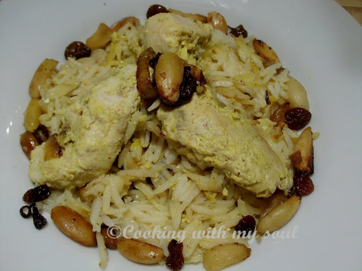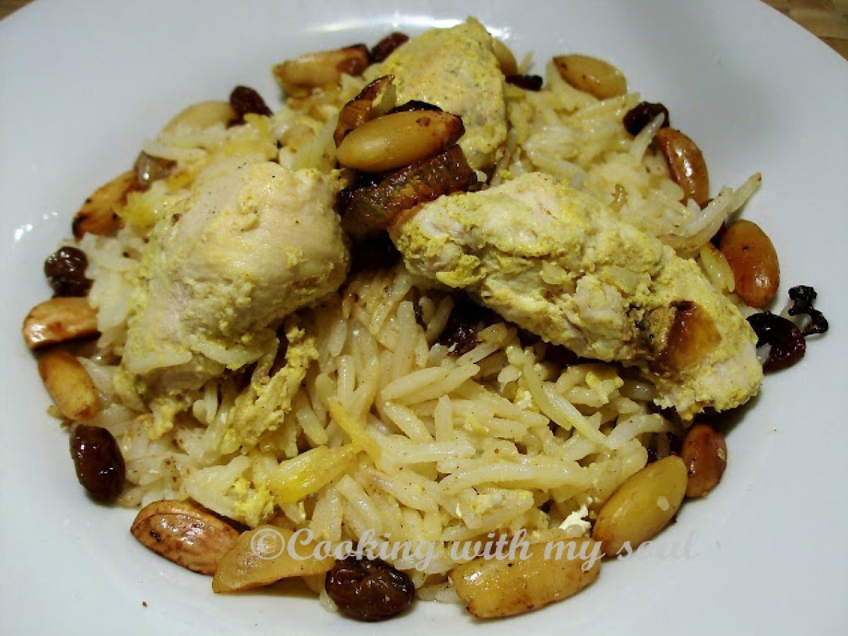 Biryani de pui (chicken biryani) PrecedentulUrmătorul Felul principalFoarte ușor45 min Trimite unui prieten Printează pagina Adresează o întrebare autorului Postează o poză cu rețeta gătită de tine Ingrediente 4 900 g piept de pui, taiat in bucati nu foarte mici 120 g iaurt 120 g unt 450 g orez basmati 3 cepe , feliate subtire 6 catei de usturoi, rasi fin 6 cm radacina de ghimbir, rasa fin 1/2 lingurita Garam Masala 1 lamaie, sucul 1/2 lingurita praf de chili 1 lingura turmeric 2 cm scortisoara 4-6 teci de cardamom verde 1/2 lingurita seminte de chimion 30 ml lapte 1/4 lingurita sofran sare dupa gust Pentru garnitura: 2 linguri unt 100 g migdale, taiate in jumatate pe lungime 50 g stafide 1 ceapa mare, feliata fin 1/2 lingurita Garam Masala