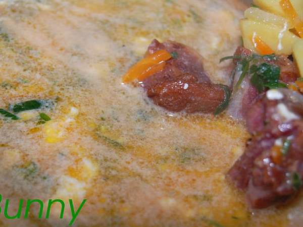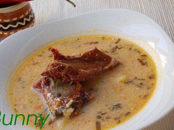 Bors cu afumatura si cartofi PrecedentulUrmătorul Felul principalFoarte ușor45 min Trimite unui prieten Printează pagina Adresează o întrebare autorului Postează o poză cu rețeta gătită de tine Ingrediente 2 1 morcov 1 ceapa 6 cartofi medii 2 scarite de porc sau garf afumate 200 g smantana 1 ou 200 g rosii pasate 1 litru de bors si o legatura de leustean