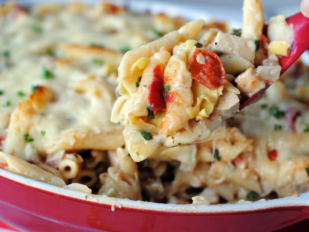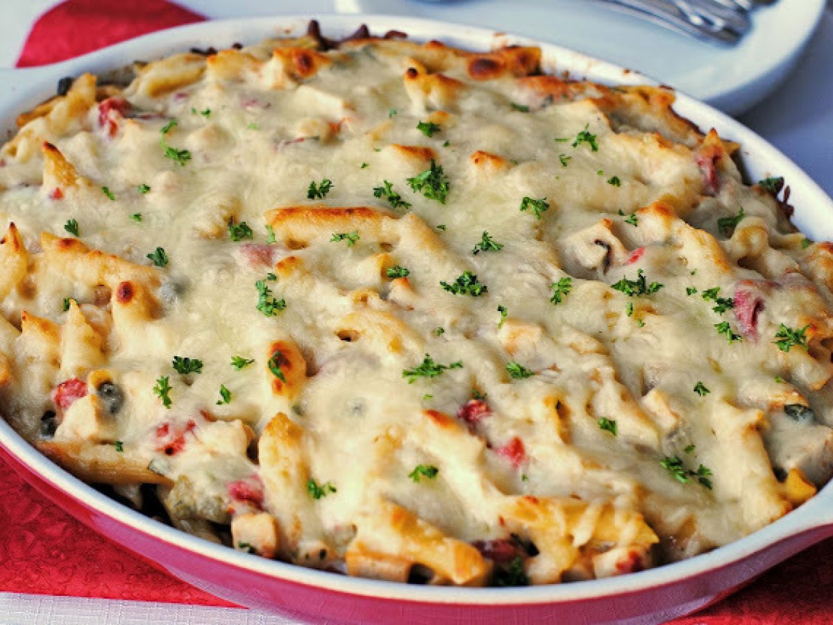 Budinca de paste cu branza si carne de pui PrecedentulUrmătorul Felul principalUșor50 min Trimite unui prieten Printează pagina Adresează o întrebare autorului Postează o poză cu rețeta gătită de tine Carne de pui, penne, mozzarella Ingrediente 6 800 grame carne de pui deja preparata (se poate folosi un pui rotisat) taiata cubulete 1 ceapa tocata marunt 4 catei de usturoi pisati 2 linguri faina 60 grame unt 500 ml supa de pui/apa 450 grame branza rasa (cheddar, cascaval, parmezan,mozzarella) 400 grame rosii taiate in bucatele 400 grame inimi de anghinare in ulei/otet (scurse de ulei sau otet) taiate in bucatele 1 ardei gras rosu taiat in cubulete 1 lingurita capere 3-4 frunze busuioc tocat 1 kg penne fierte conform instructiunilor de pe ambalaj, strecurate