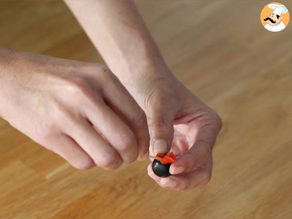 Ochii: folosind o scobitoare, luati o felie de ardei rosu marinat, introduceti un capat in maslina neagra, apoi pliati cealalta parte in interior. Puneti maslina cu ardei in varful scobitorii si procedati la fel si cu al doilea ochi.