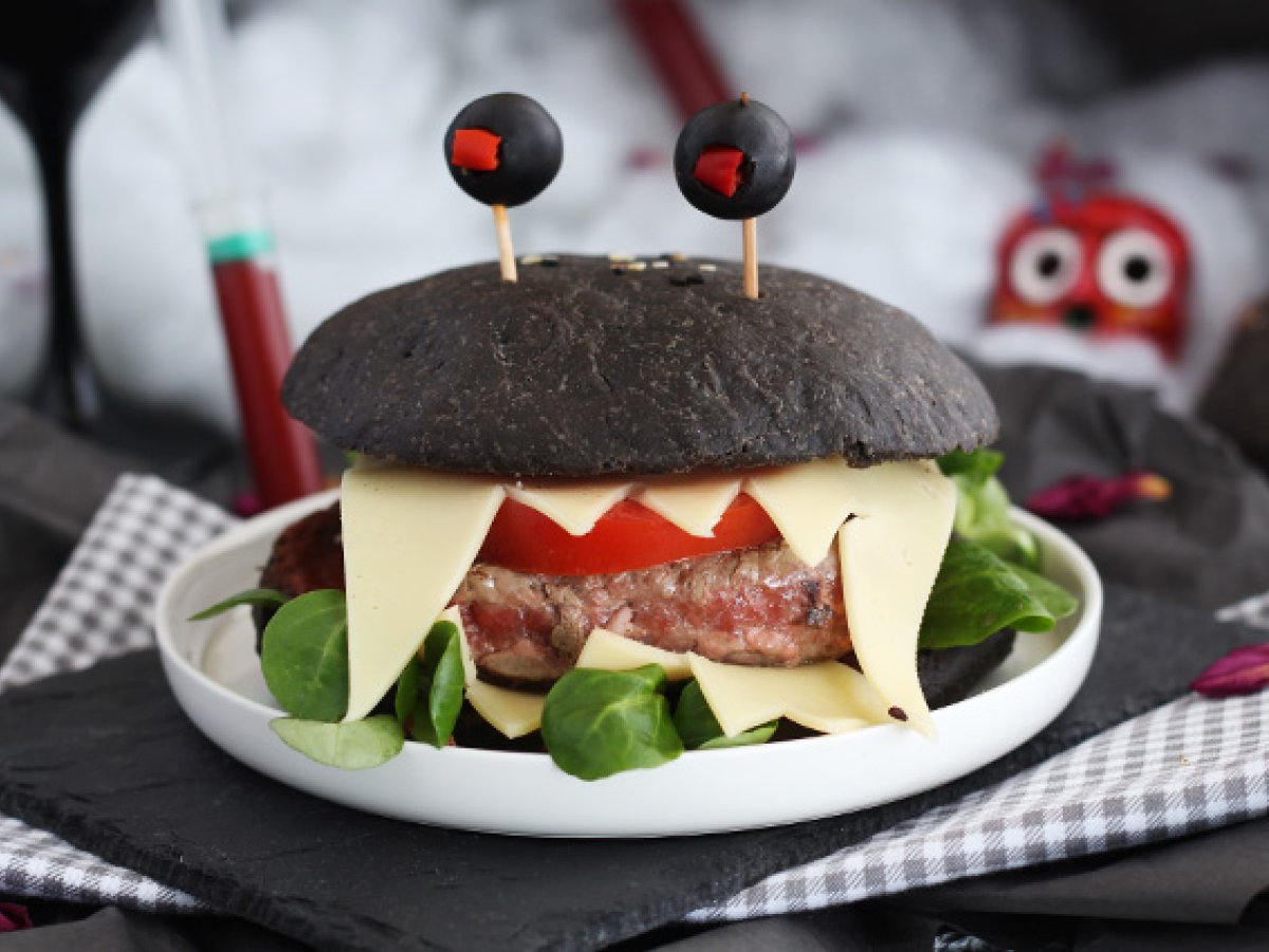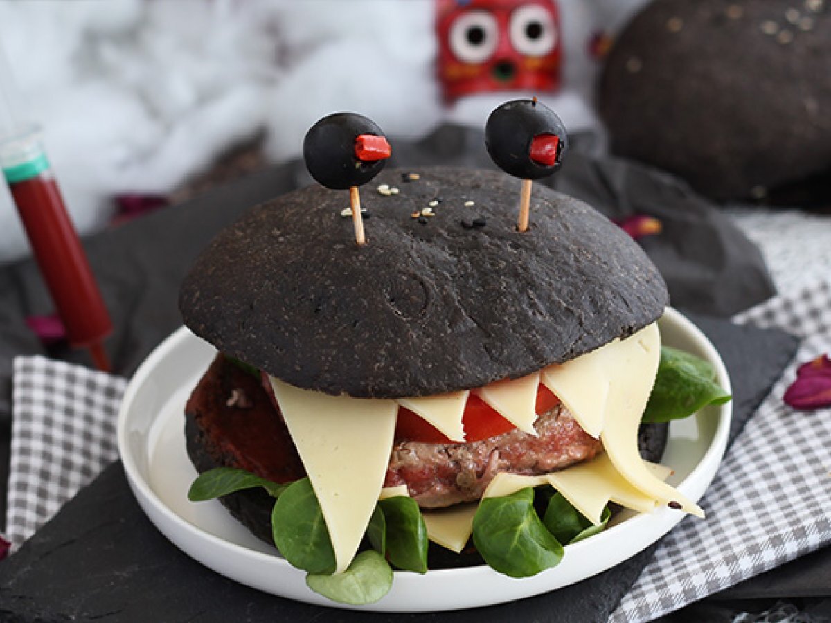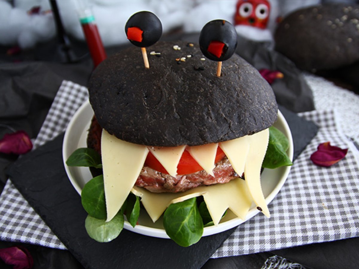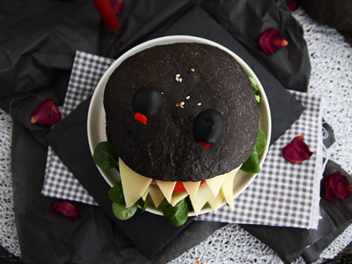 Un hamburger monstruos de dragut pentru masa dvs. de Halloween! Copiii il vor indragi, facem pariu! -) Paine neagra colorata cu cerneala de sepie, ochi din masline, dinti din brânza, pe scurt! Urmariti pas cu pas toate etapele realizarii burgerului nostru monstru din explicatiile scrise, fotografiilor, precum si a videoclipului mai jos!