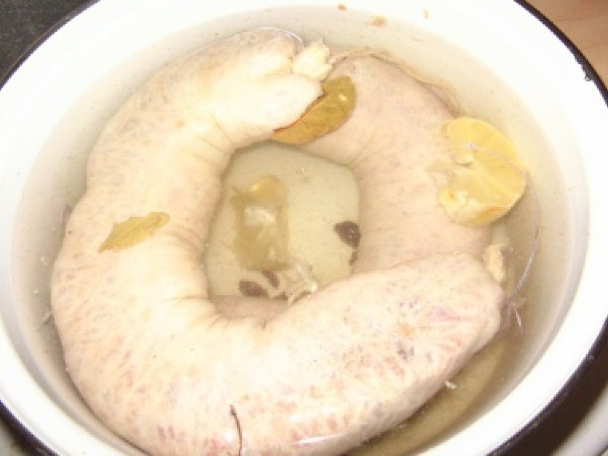 Caltabos muntenesc PrecedentulUrmătorul Felul principalFoarte ușor4 ore Trimite unui prieten Printează pagina Adresează o întrebare autorului Postează o poză cu rețeta gătită de tine Ingrediente 4 1 mat gros de porc 1/2 kg carne amestec 1 cescuta de orez 1 lingura gris 1 ceapa tocata marunt 1 morcov ras 10 stafide 1 foaie dafin 1 lamaie piper cimbru