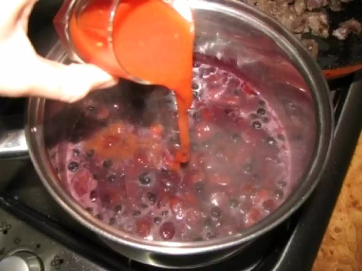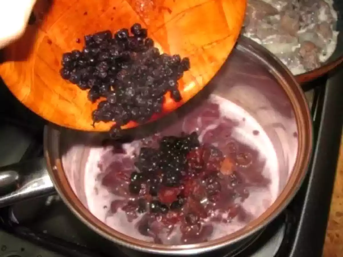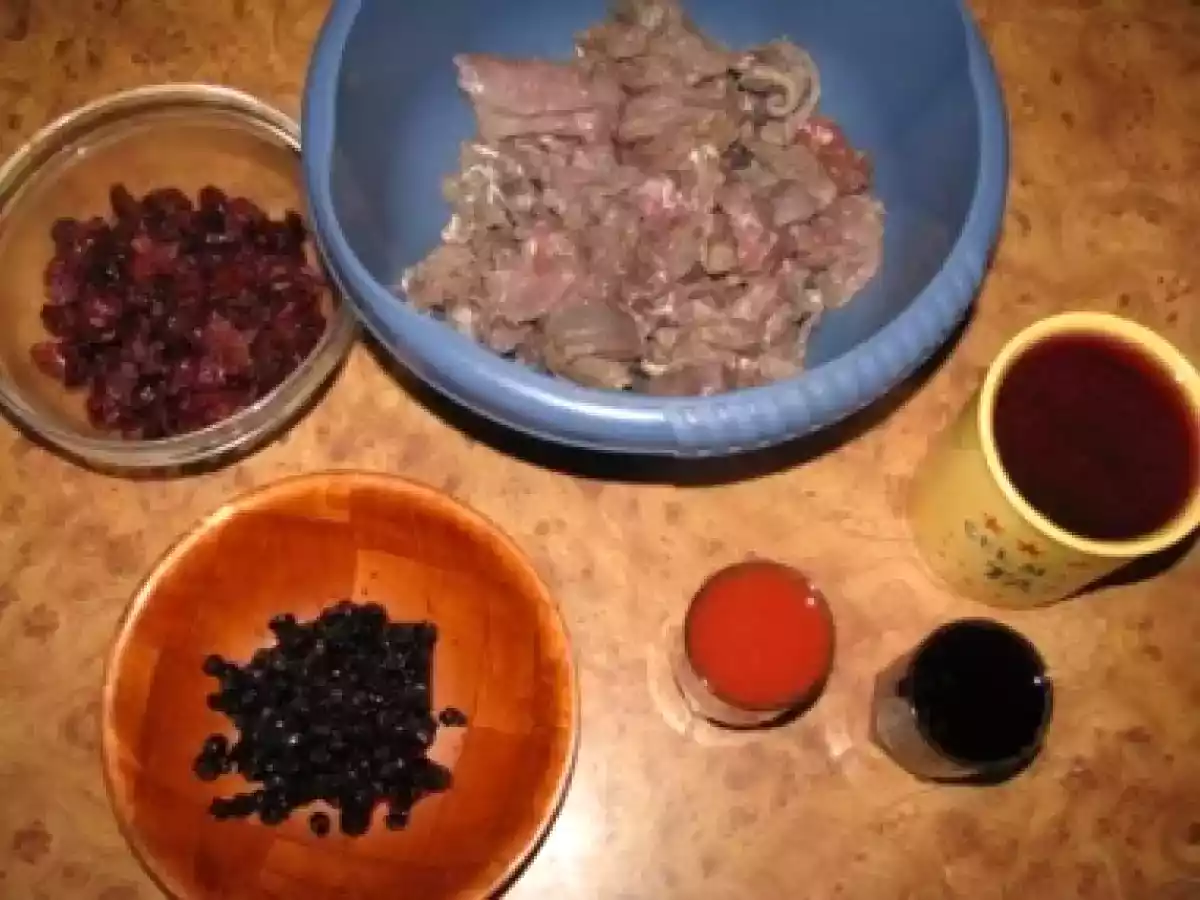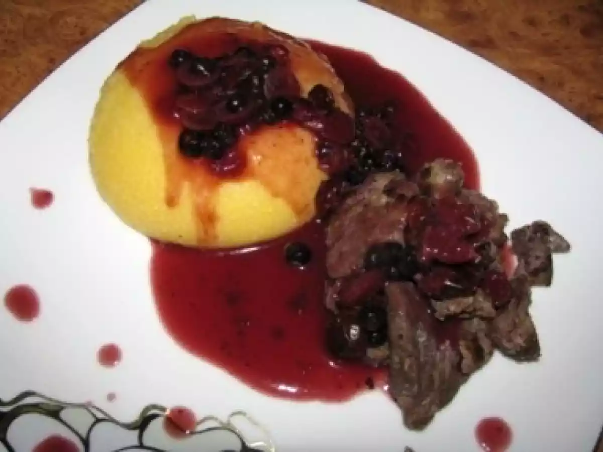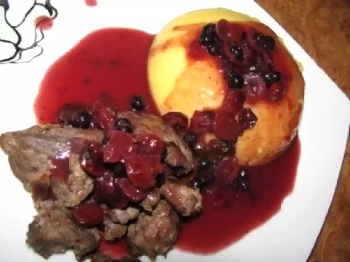 Caprioara cu sos de merisoare si afine PrecedentulUrmătorul Felul principalFoarte ușor1 oră Trimite unui prieten Printează pagina Adresează o întrebare autorului Postează o poză cu rețeta gătită de tine Ingrediente 4 500 g carne de cerb, dezosata 1 frunza de dafin 1 ceapa rosie, tocata 1 lingura ulei 250 ml vin rosu 1 lingura faina 100 g merisoare uscate, inmuiate in apa calda cu rom 50 g afine 50 ml bullion de rosii 50 ml sirop de afine sau merisoare Sare si piper negru