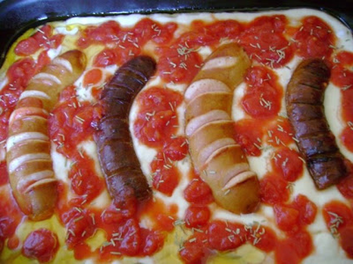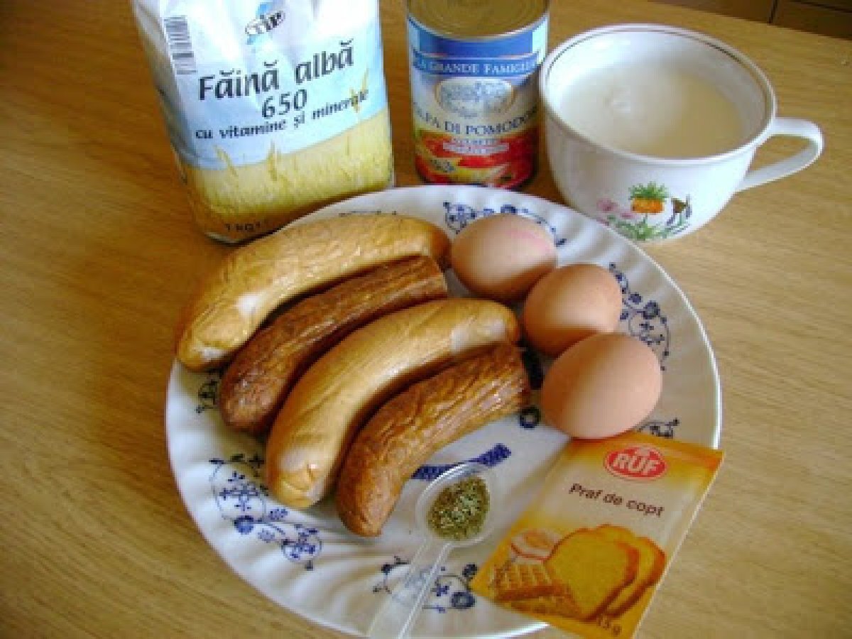 Carnati la cuptor in aluat de clatite PrecedentulUrmătorul Felul principalFoarte ușor1 oră Trimite unui prieten Printează pagina Adresează o întrebare autorului Postează o poză cu rețeta gătită de tine Aluatul acesta in combinatie de carnatii si rosiile este ceva extraordinar. Ingrediente 4 3-4 carnati 3 oua 250 ml lapte sau apa minerala 400 g faina 200 g rosii in bulion taiate marunt ½ lingurita praf de copt 4 linguri ulei de masline 1 lingurita rozmarin sare, piper