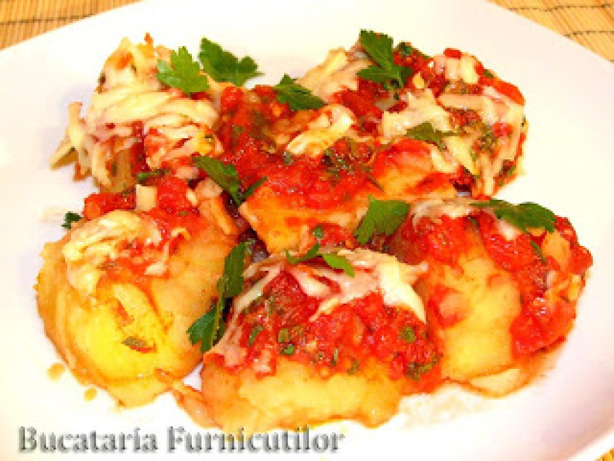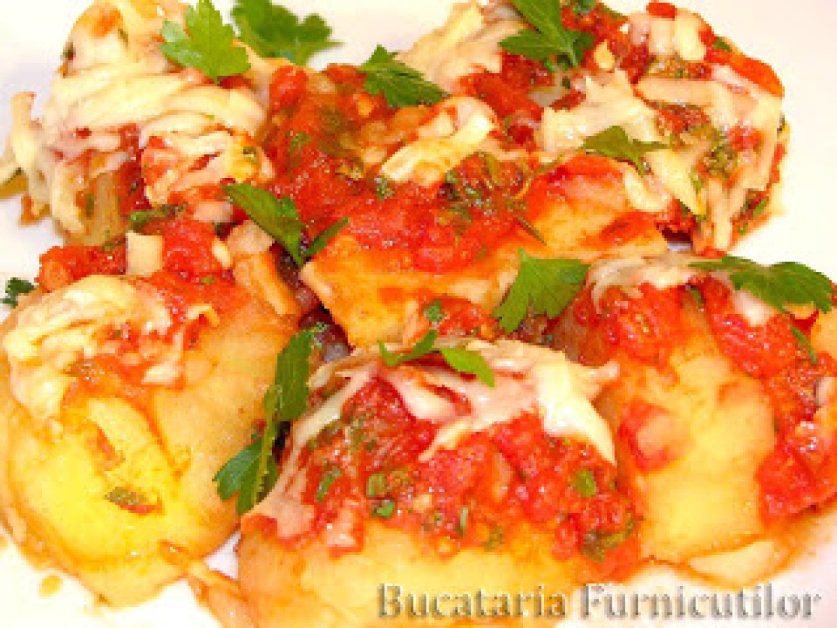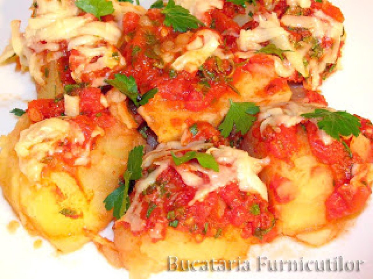 Cartofi aromati PrecedentulUrmătorul Felul principalFoarte ușor40 min362 Kcal Trimite unui prieten Printează pagina Adresează o întrebare autorului Postează o poză cu rețeta gătită de tine Ingrediente 4 1 kg de cartofi 400 g rosii decojite 50 g cascaval 2 - 3 catei de usturoi o legatura de patrunjel sare, piper 2 linguri ulei Cost estimat: 3.59Euros€ (0.9€/porție)