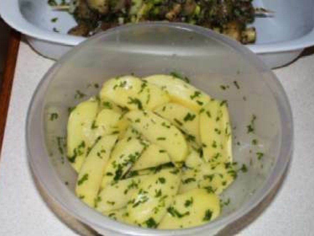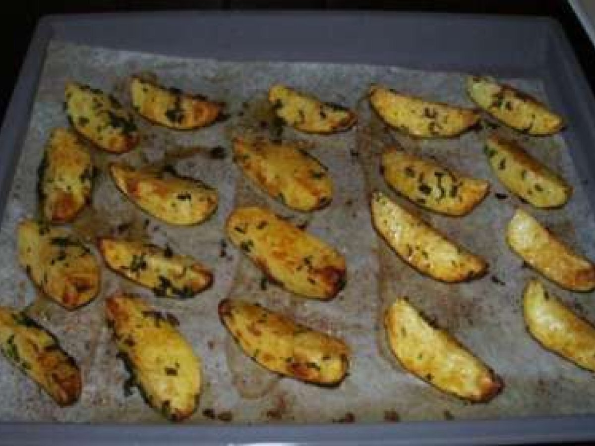Cartofi buni si rapizi la cuptor PrecedentulUrmătorul Felul principalFoarte ușor1 h 30 m Trimite unui prieten Printează pagina Adresează o întrebare autorului Postează o poză cu rețeta gătită de tine Ingrediente 1 cartofi,de preferinta mai mari,(cant. dupa preferinta) se spala. se taie in jumatati sau sferturi,depinde de marimea lor, 1 legatura patrunjel verde 1 legatura frunze de usturoi verde(merge si catei de usturoi pisati) ulei de masline sau vegetal. Cartofii astfel pregatiti se pun intr-un castron se pune ulei deasupra si verdeturile tocate marunt si se amesteca bine ,in asa fel incit uleiul si mirodeniile folosite sa cuprinda toate partle cartofilor.
