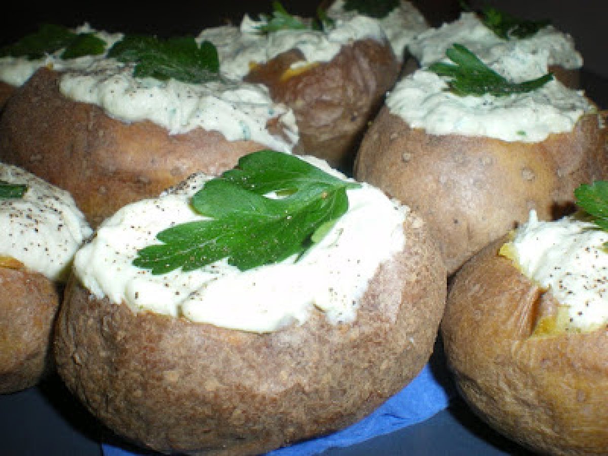 Cartofi copti,umpluti cu crema de branza Felul principalFoarte ușor25 min Trimite unui prieten Printează pagina Adresează o întrebare autorului Postează o poză cu rețeta gătită de tine Ingrediente 4 9 cartofi mai maricei 200 g branza de oi 200 g smantana 2 cepe verzi cateva fire de patrunjel verde delikat sare piper.